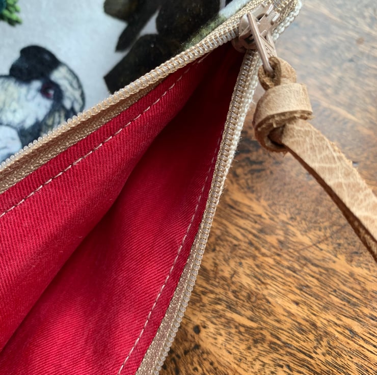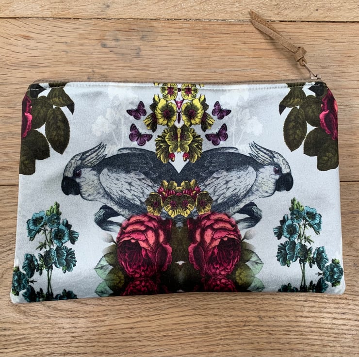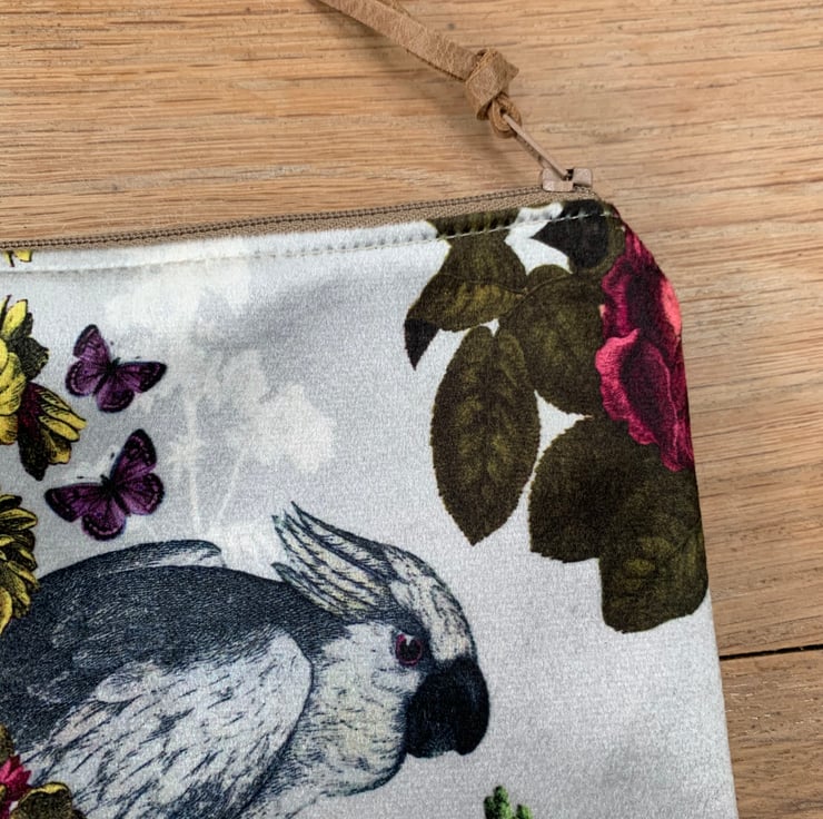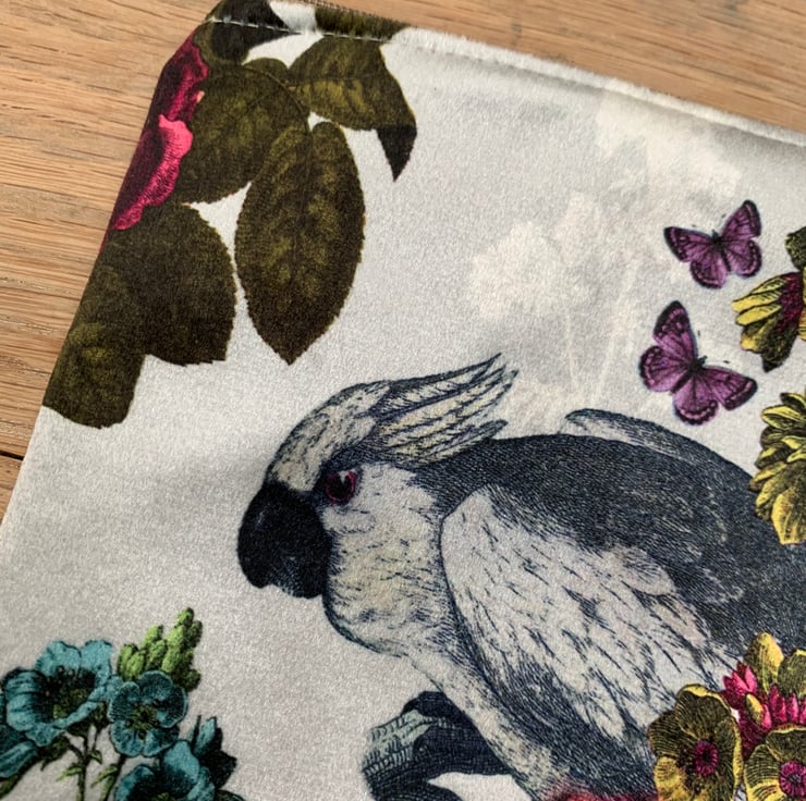 Soft velvet zip purse with linen back in beautiful shades of grey, green and pink. Pretty cockatiels by Marianne Ley Design are surrounded by vibrant flowers and butterflies.