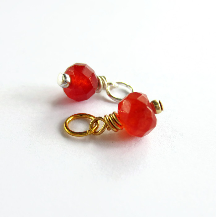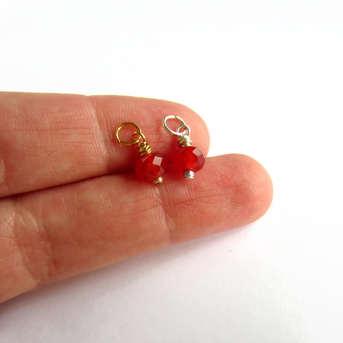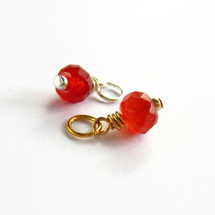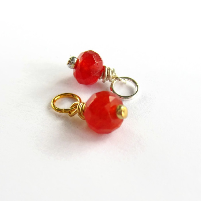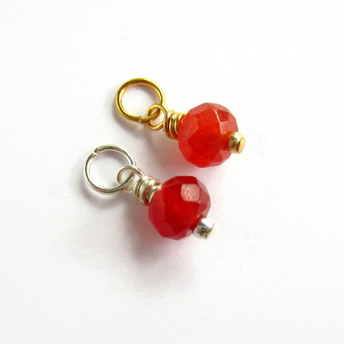 A single, prettily faceted, red / orange genuine carnelian gemstone bead is securely wire wrapped by hand to create a delicate dangle charm or pendant ready for you to add to your own jewellery creations.
