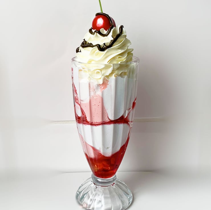 Extremely realistic display Knickerbocker Glory ice cream sundae fake food prop in a real glass with fake fruit and rich whipped cream and jelly. It's topped with fake chocolate sauce and a fake realistic cherry.