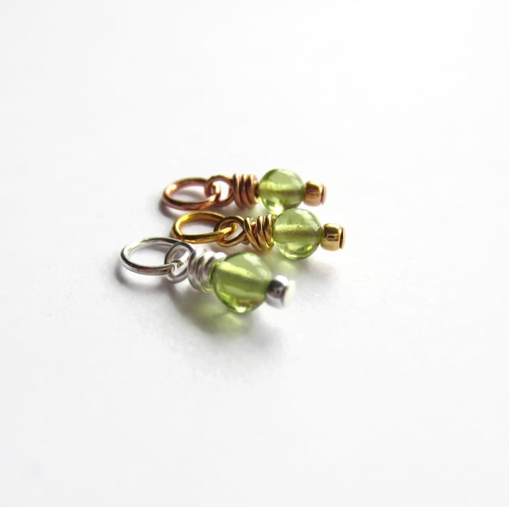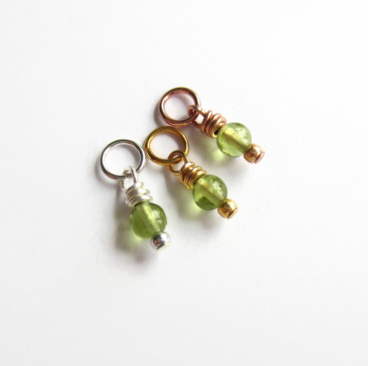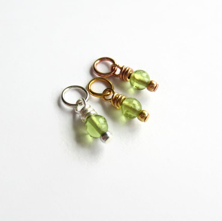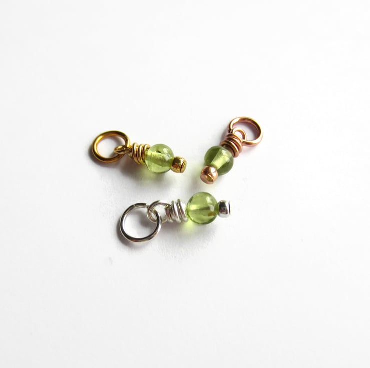 Tiny, smooth, round, 3.5mm genuine peridot gemstone beads, August's birthstone, are securely wire wrapped by hand to create a dainty dangle charm ready for you to add to your own jewellery creations.