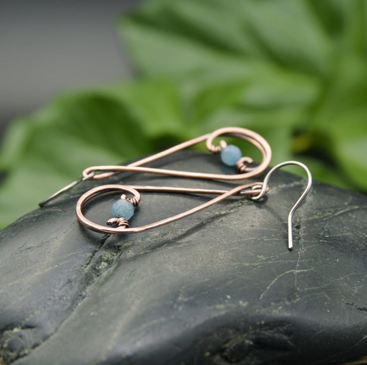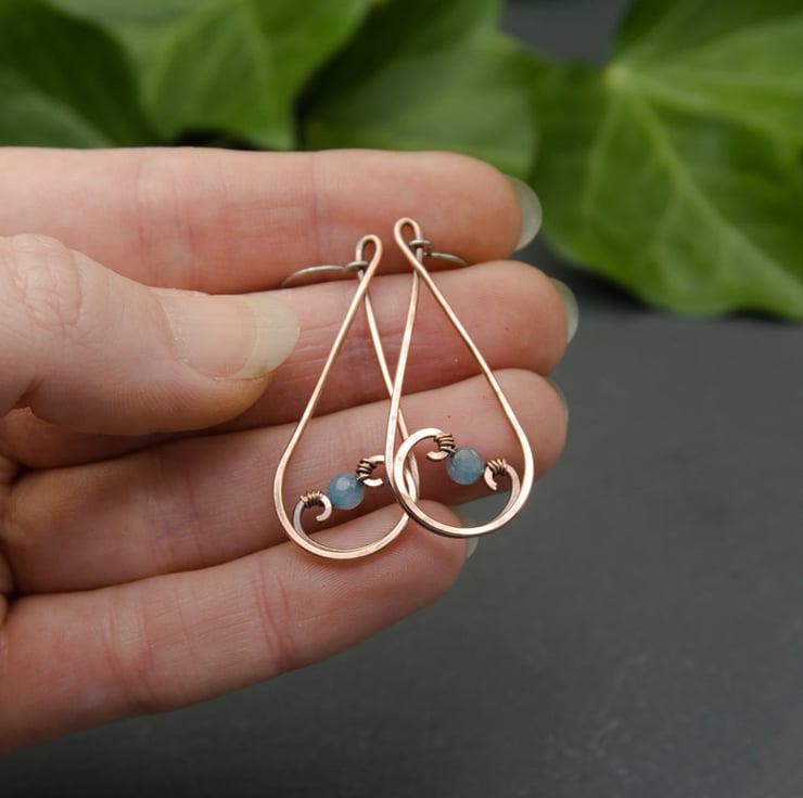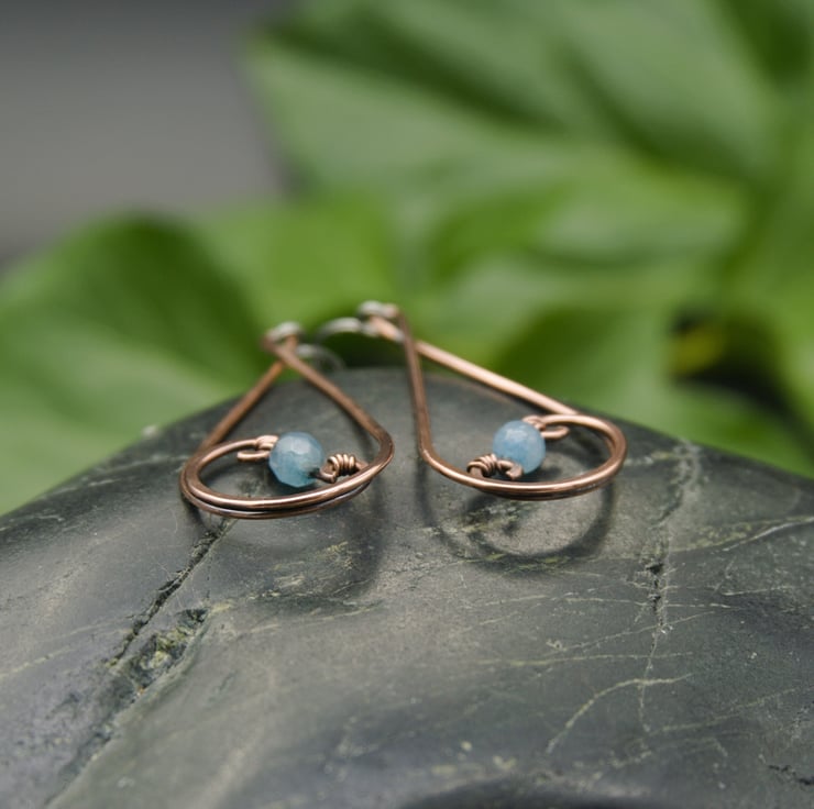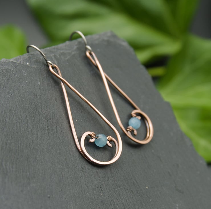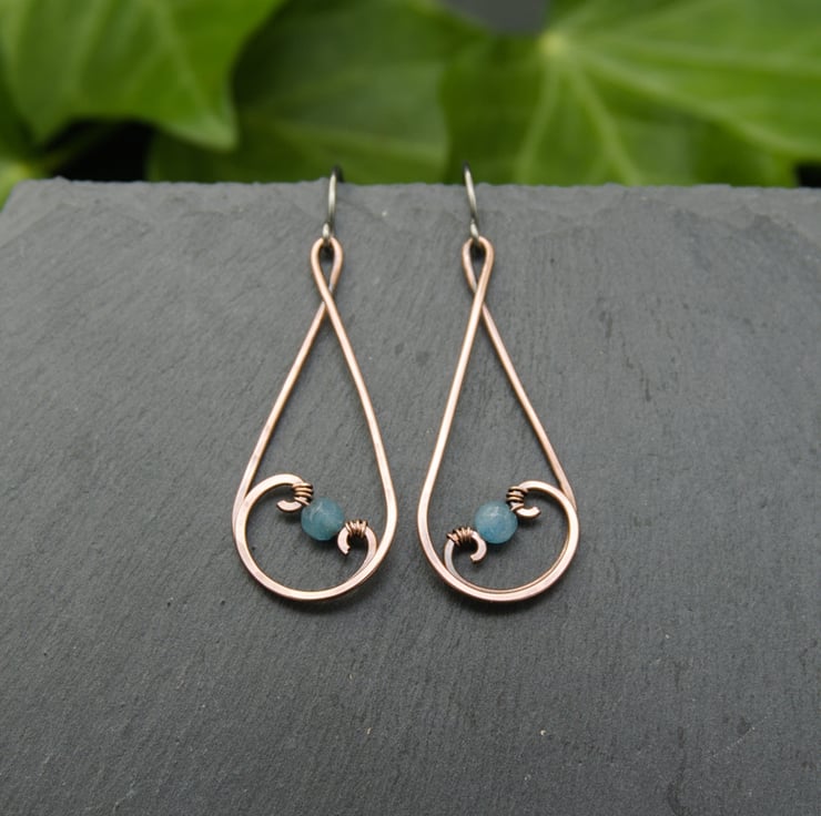 These gorgeous earrings have been entirely handmade from copper wire. I've formed simple teardrop shapes, swirling the ends inwards & hammering them flat. I've then wrapped a 4mm faceted Jade bead between the swirls of each earring to complete the design. The Jade beads are a lovely pale blue which looks really pretty with copper. These elegant dangle earrings would make the perfect addition to any outfit!