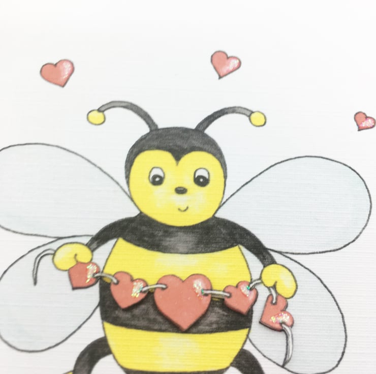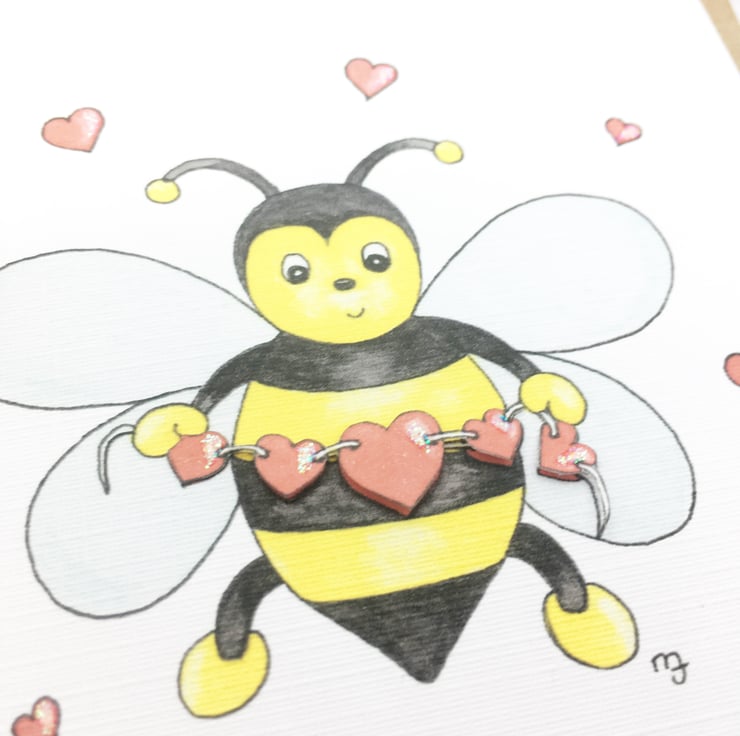 This cute Bee mine card has been designed using my own original watercolour illustration. The card has been printed out onto good quality linen embossed card and decoupaged up in parts. The card has been finished off with a little glitter detail.