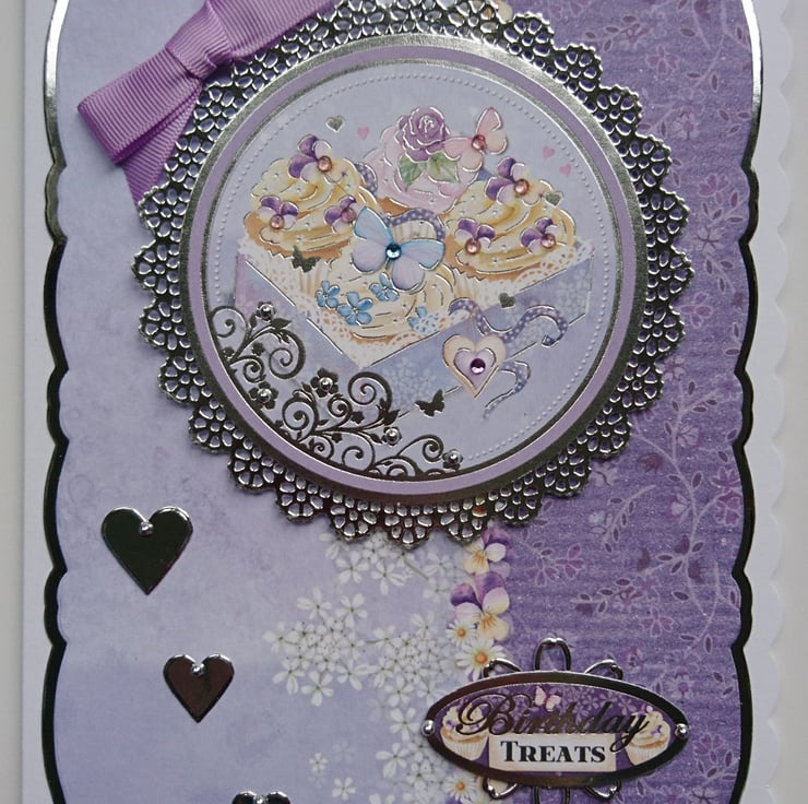 The 3D sentiment is also silver foiled and says "Birthday Treats" and the card has been finished with gems, hand-cut and silver foiled love hearts, and a matching ribbon bow.