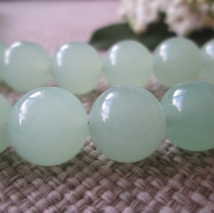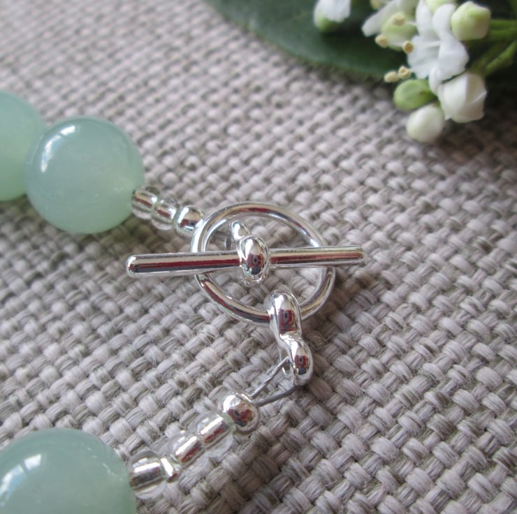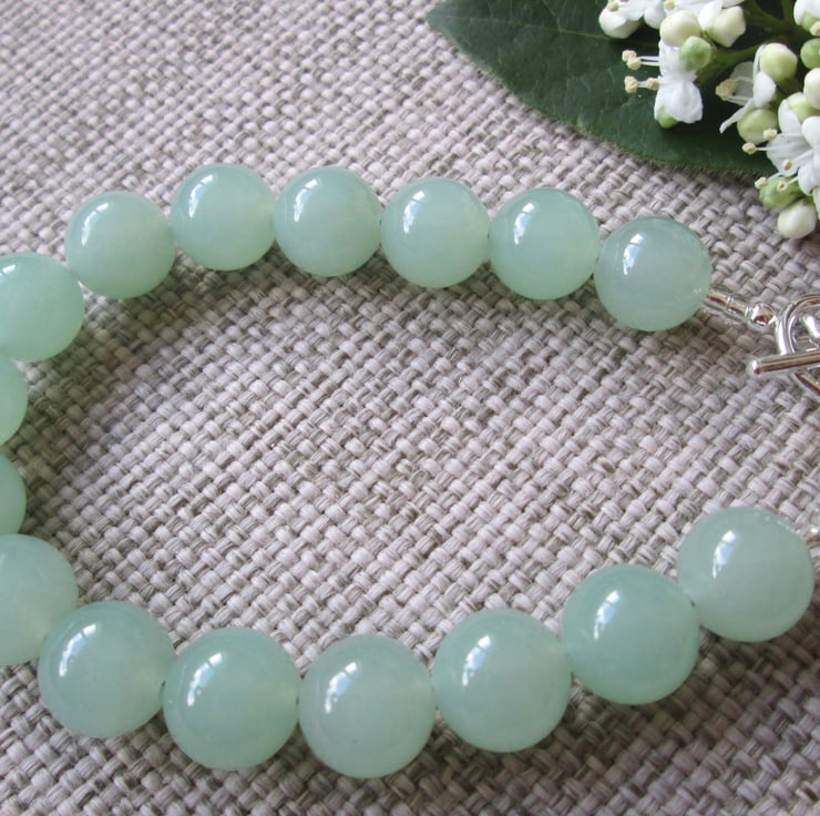 A beautiful bracelet made with pale green Quartzite beads (beads are 10mm in diameter), with a silver-plated toggle clasp. The bracelet is approximately 20cm in length (if you would prefer a different length please add a 'note to seller' to your order). A gorgeous bracelet in a beautiful subtle colour. Coordinating earrings and necklace are also available.