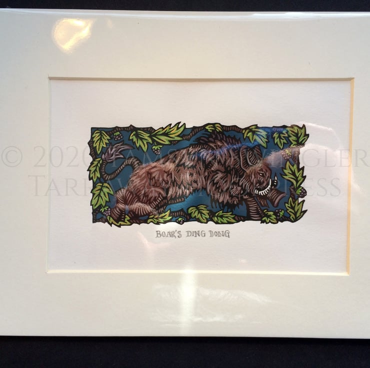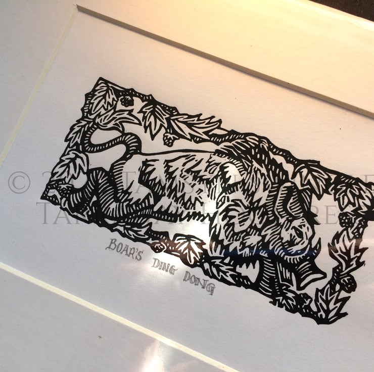 Inspired by Illuminated Manuscripts and the animal associated with Richard III, the Boar, this print is available in black and white and also in a hand-painted version with a touch of lustrous gold detail. This Boar is surrounded by brambles and blackberries but is on a rampage. The name stuck as it seemed to be an important part of heraldry in the olden days.