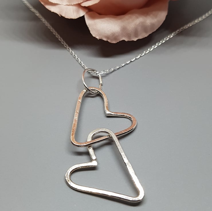 The pendant is made from two hearts shaped and finished to matcht he earrings but loosely linked so that they can move independantly and create different shapes as they move as the wearer moves.