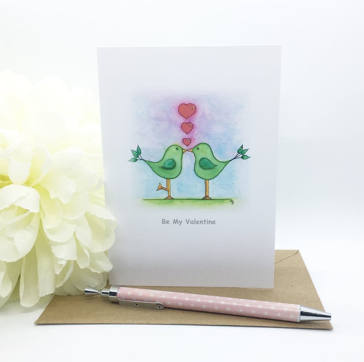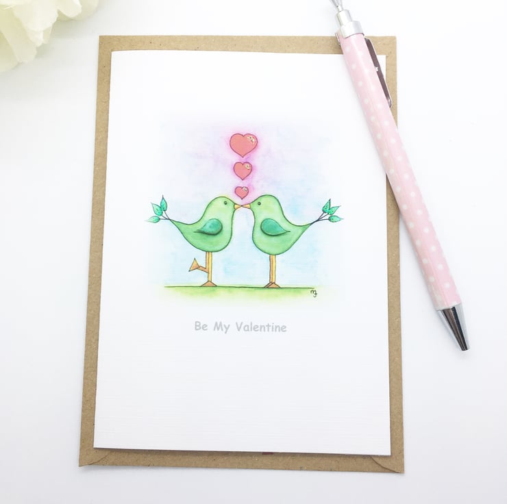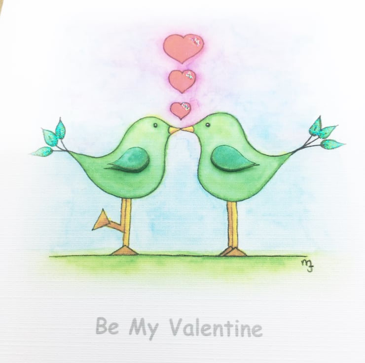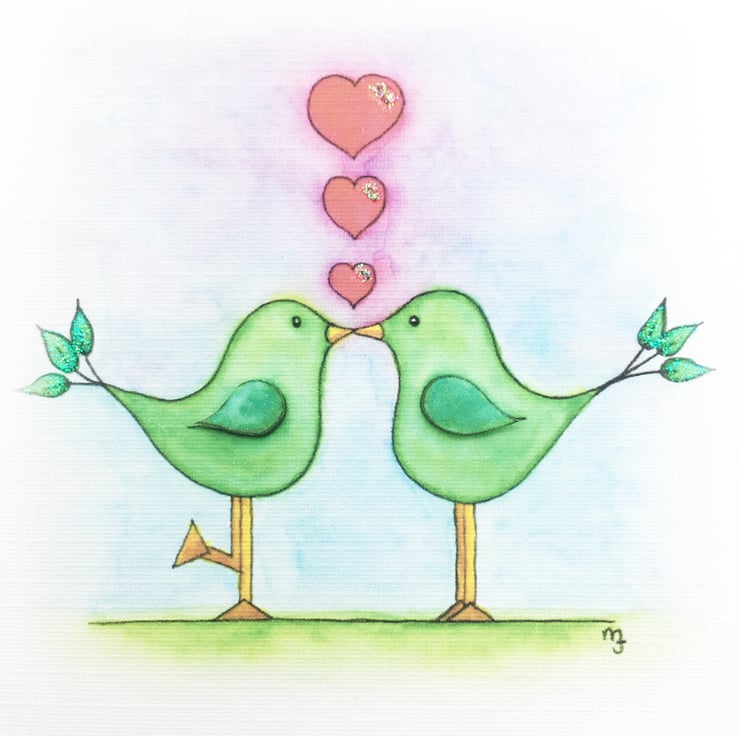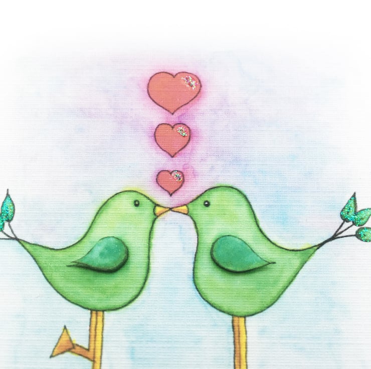 This cute Love Birds card has been designed using my own original watercolour illustration. The card has been printed out onto good quality linen embossed card and decoupaged up in parts. The card has been finished off with a little glitter detail.