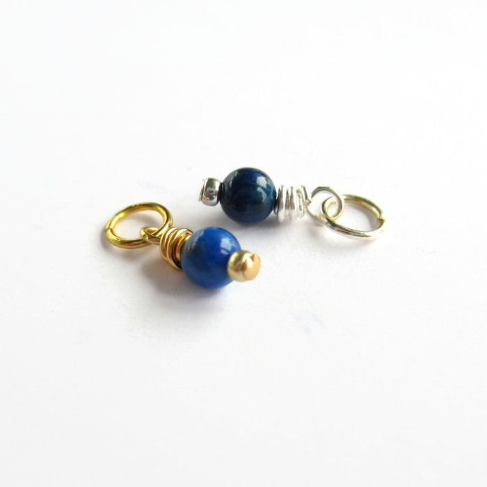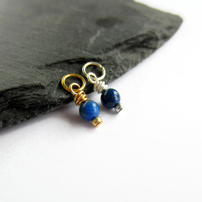 Pretty little smooth, round, 4mm genuine lapis lazuli gemstone beads are securely wire wrapped by hand to create a dainty dangle charm ready for you to add to your own jewellery creations.