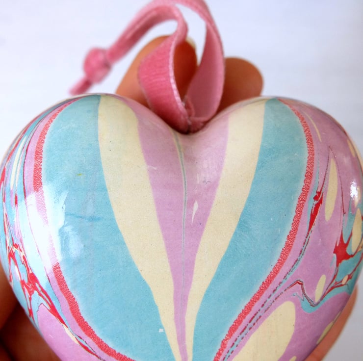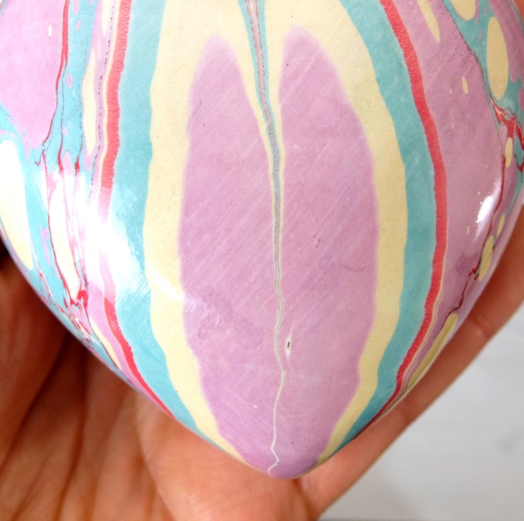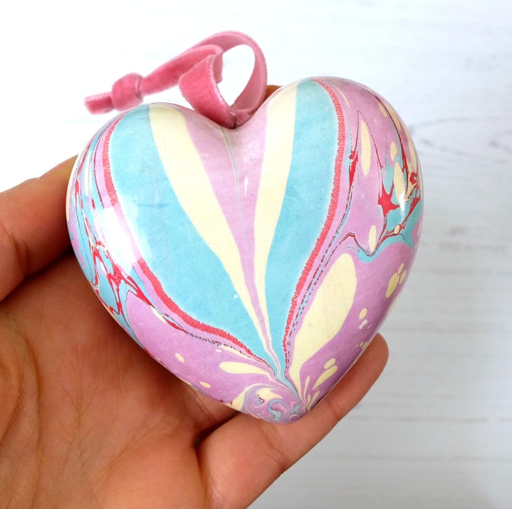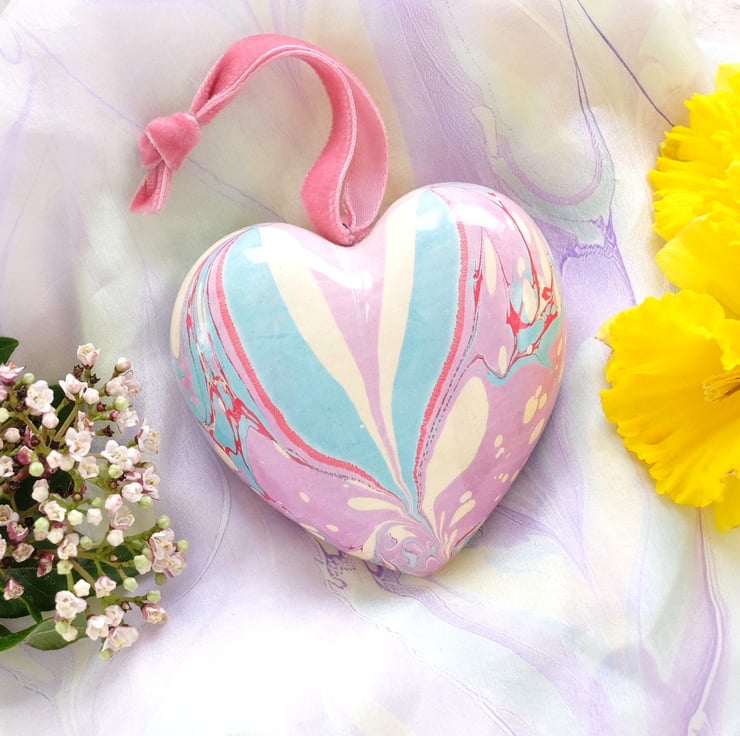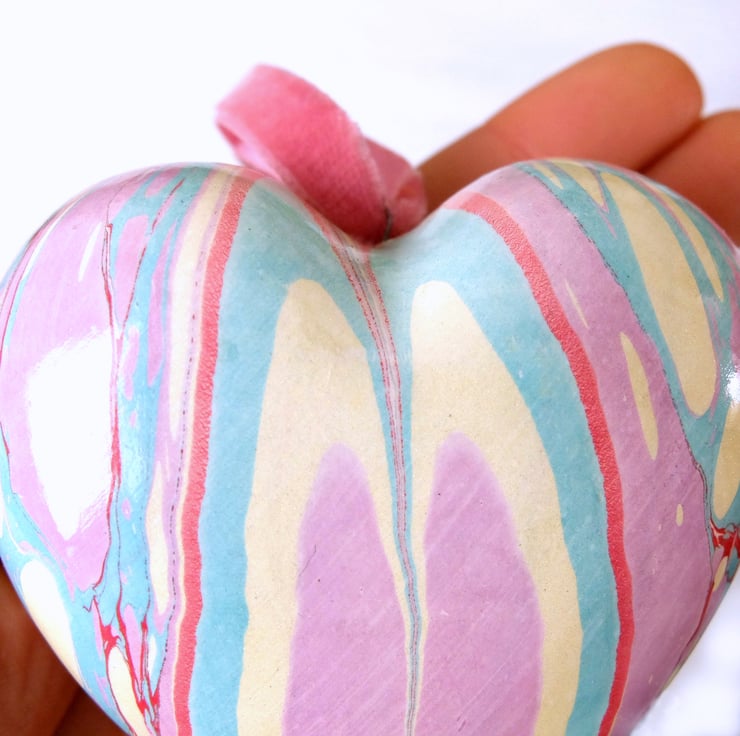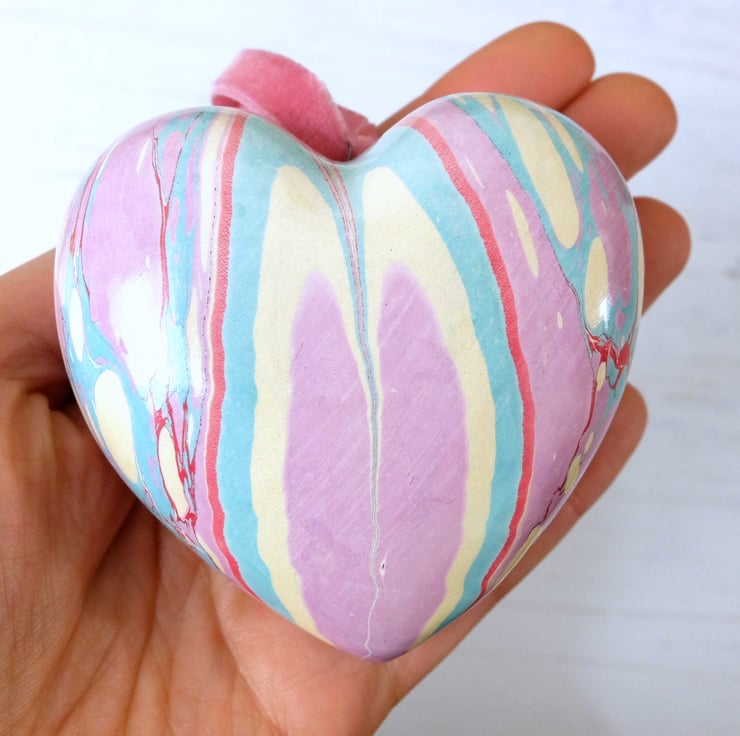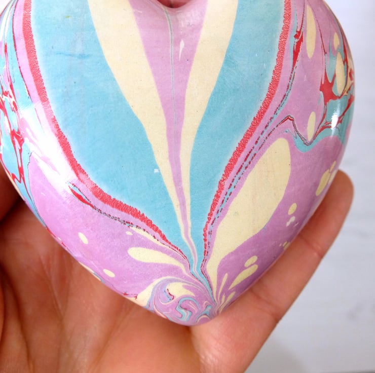 A softer and more subtle coloured marbled design on this heart with pink- lilac, light turquoise, pale gold and crimson veins.