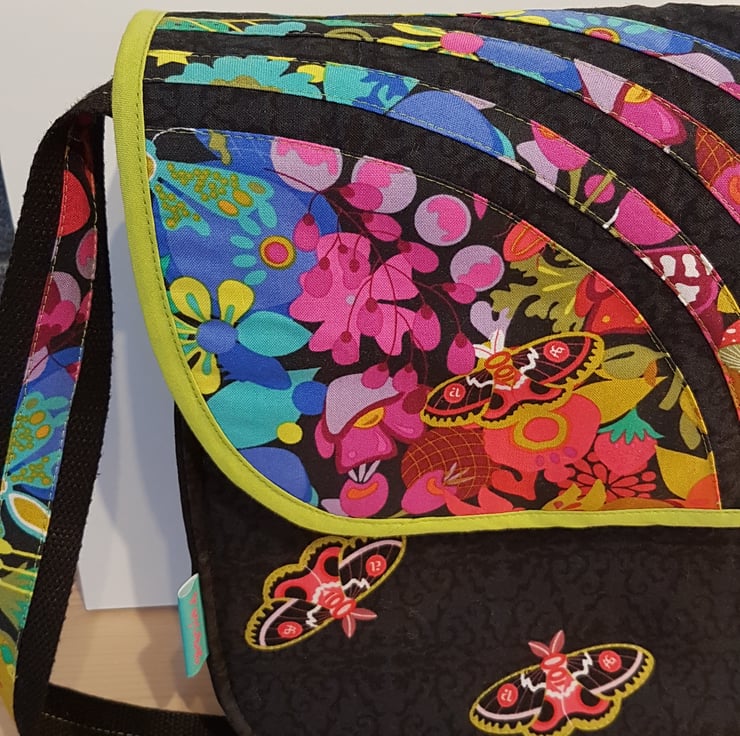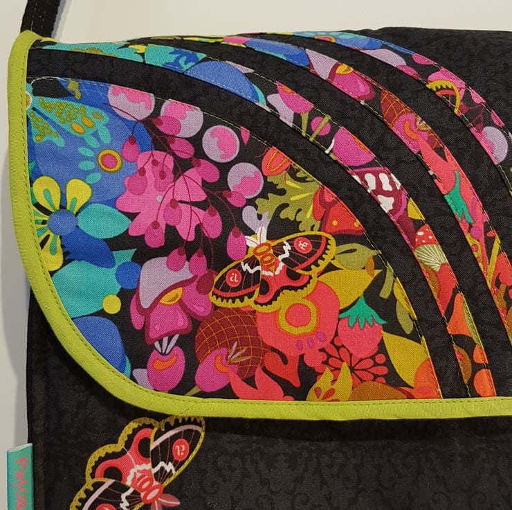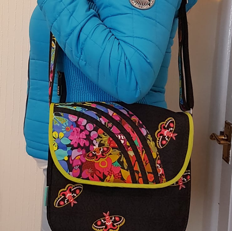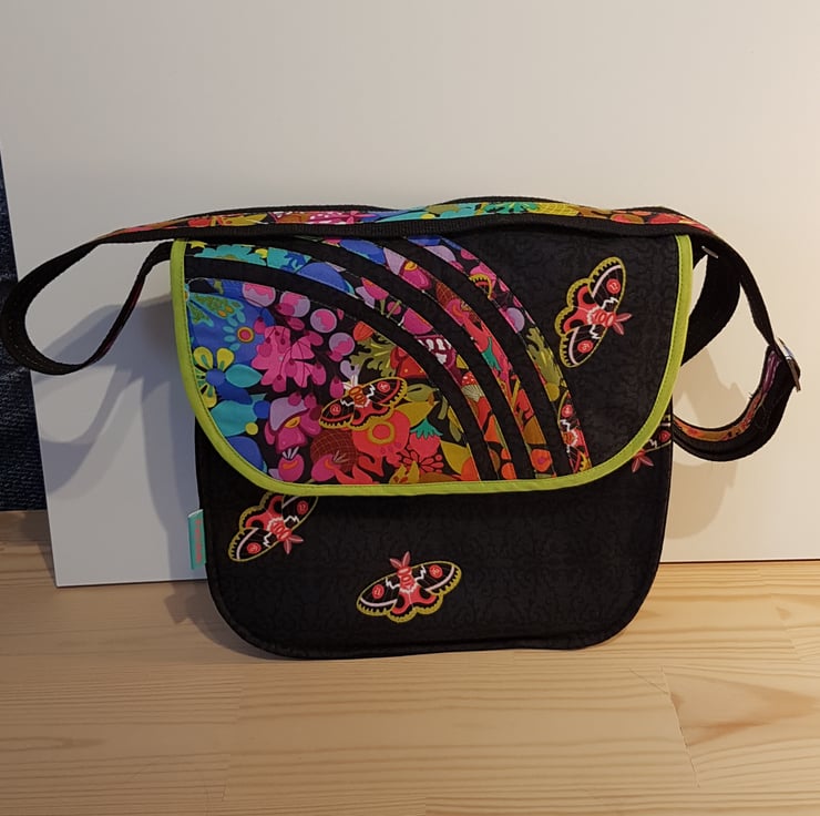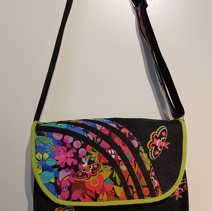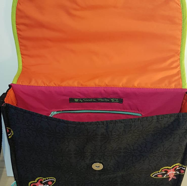 Handmade patchwork shoulder bag.This is big size bag with adjustable shoulder strap,magnetic closure on the front and inside pocket with zipper closure. The bag is black with very nice colorful flowers and butterflies paterned patchwork details not only on the bag,but on the shoulder strap as well.Dimensions:width: 30cm,hight:27cm,depth:7,5cm on bottom,adjustable shoulder strap.Made with longer strap now (based on my customer review )comfortable can use as a crossbody bag as well.The bag has pink and orange waterproof lining.
