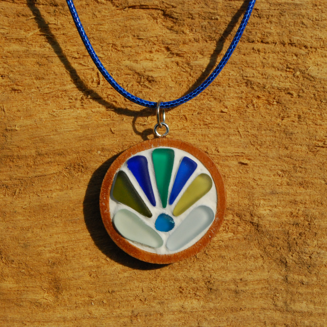 We collect tiny pieces of beach glass of unusual colours, and bring them together in our mosaic pendants. This one is a collection of tiny shards including a beautiful bright aquamarine one. The shards create a 1930s sunburst effect. Such shards are very rare and this is the only pendant we have been able to make of this kind so far. We have tumbled the glass so it is smooth and finely frosted. The back of the pendant is coloured wood.