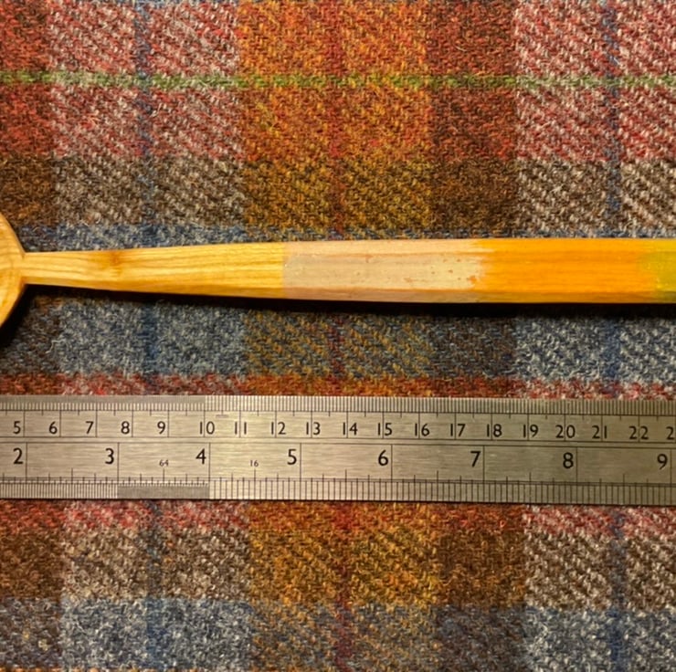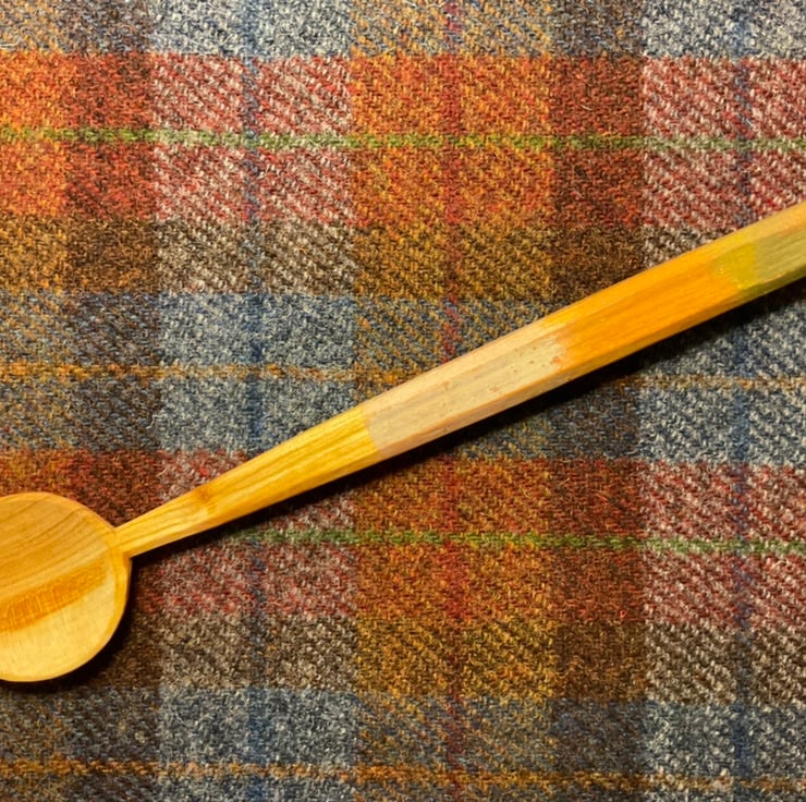 This spoon has been made using traditional methods splitting the material out from a fresh sawn log, sourced from a local tree surgeon. A rough shape for the spoon is then axed out, before moving onto a variety of knives to hone the shape. Once dry, the spoon has then been given a 3 colour coat of food-safe milk paint to the handle area, followed by burning in my makers mark. The spoon has then been burnished with a scottish pebble and sealed using organic food grade linseed oil.