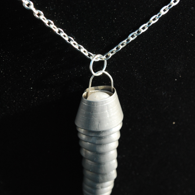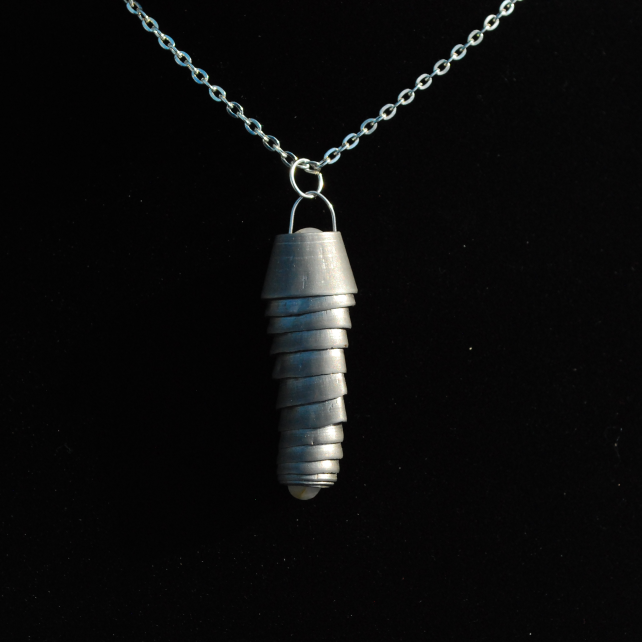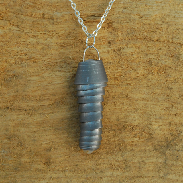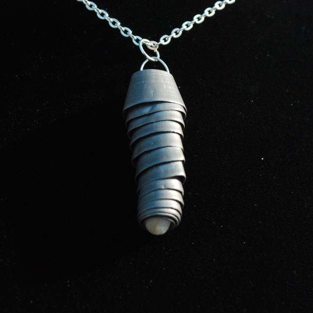 We love to make unusual pendants and this one is a visual treat. It is a large metal filing, also known as swarf. It is a by-product of metal machining, so is industrial waste. Because it has been tumbled in sand by the sea the top and bottom edges are not sharp, but it would not be suitable for a child to play with. More evidence that this is beach metal can be seen at both ends of the pendant, as the centre of each end has a tiny pebble stuck in it. (We cannot guarantee that these will not fall out, but they seem to be stuck fast).The result is an amazing, totally unique eye-catching pendant.