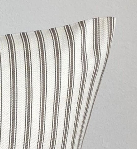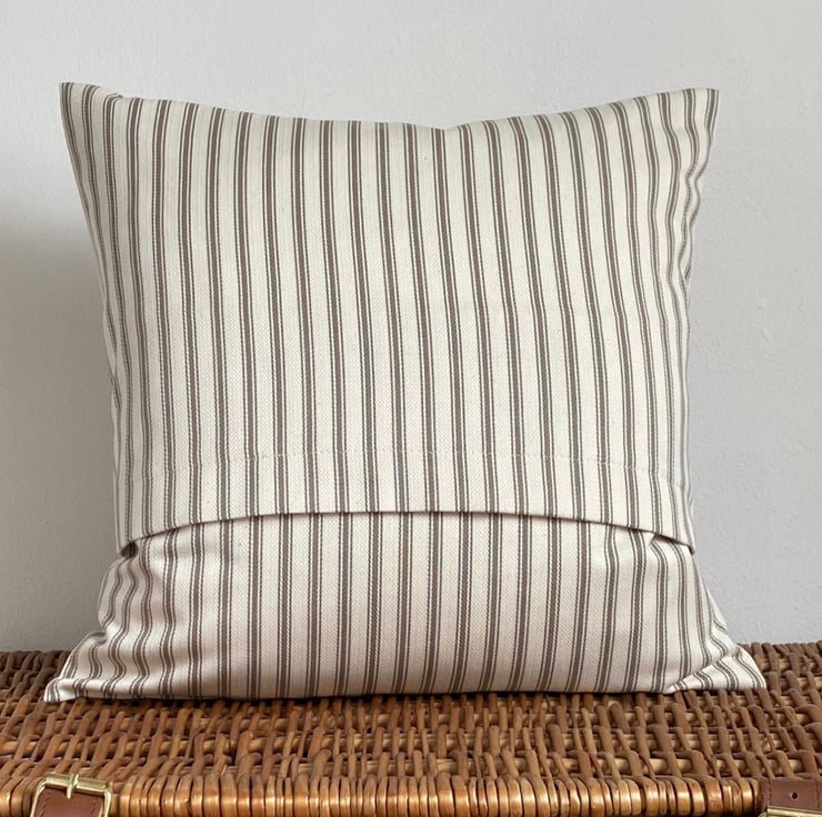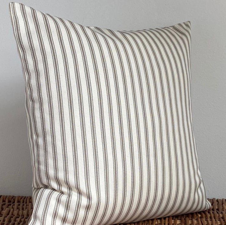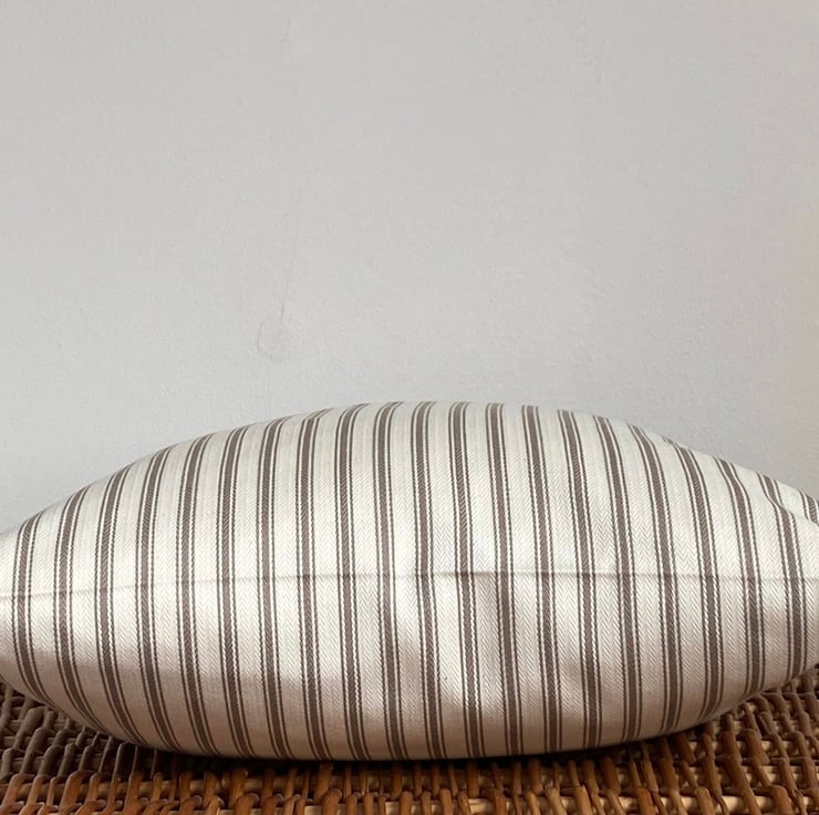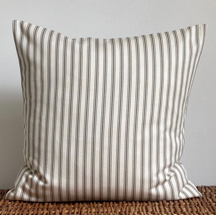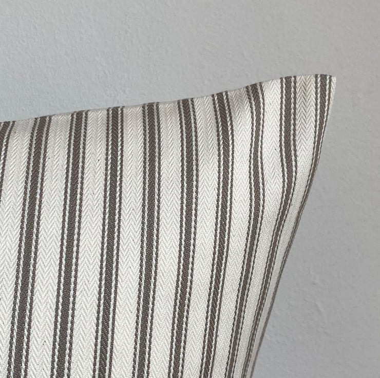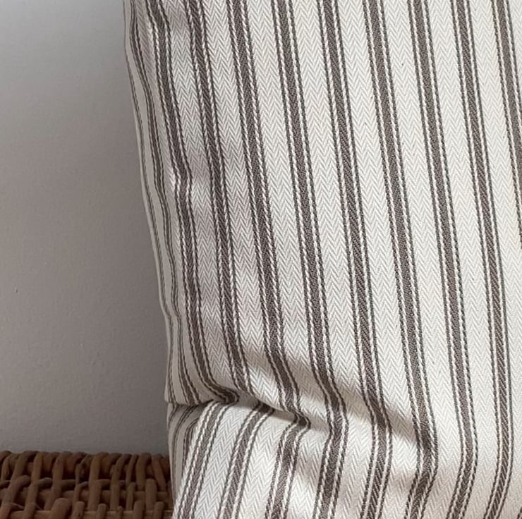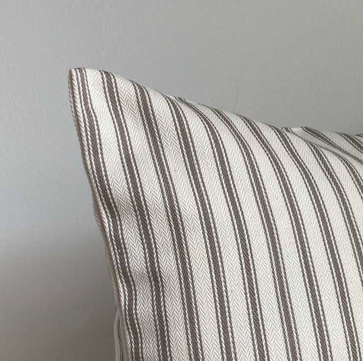 Ticking cushion cover with beige stripes on a cream background. This is a lovely ticking fabric, with beige stripes woven in a herringbone pattern, onto a cream background.