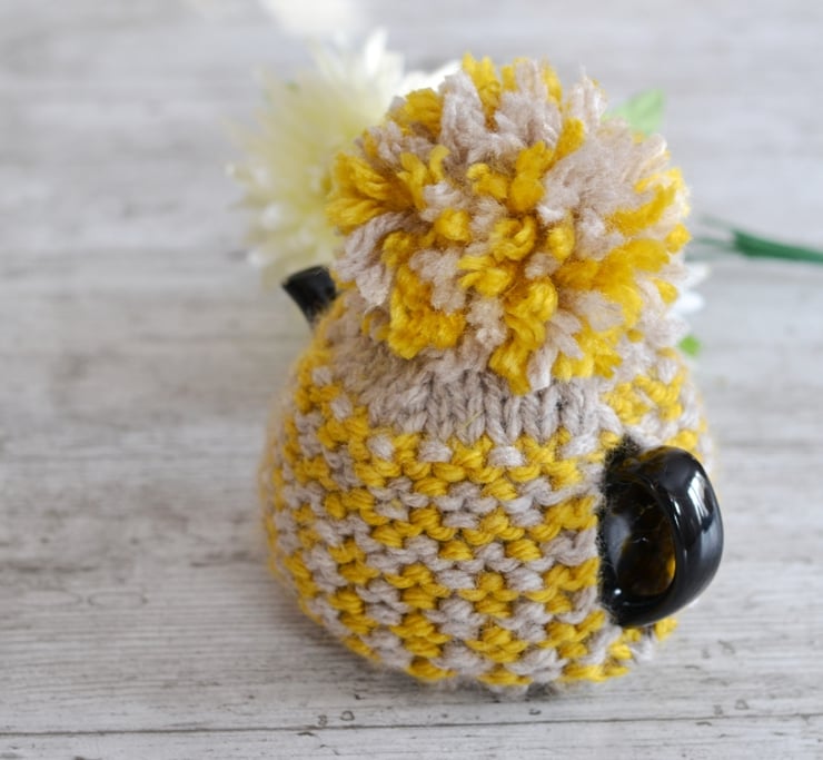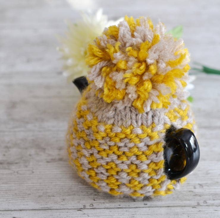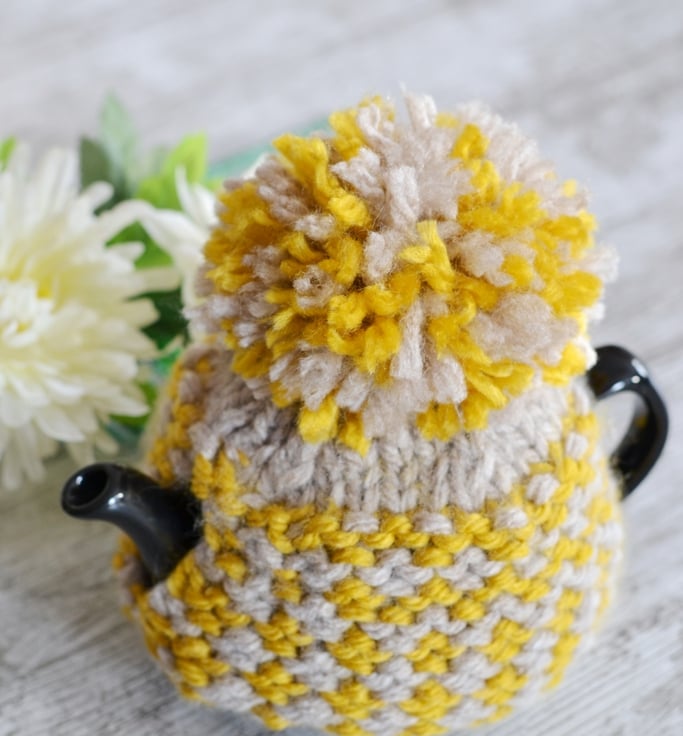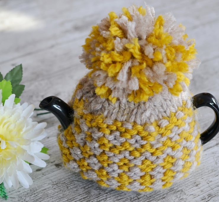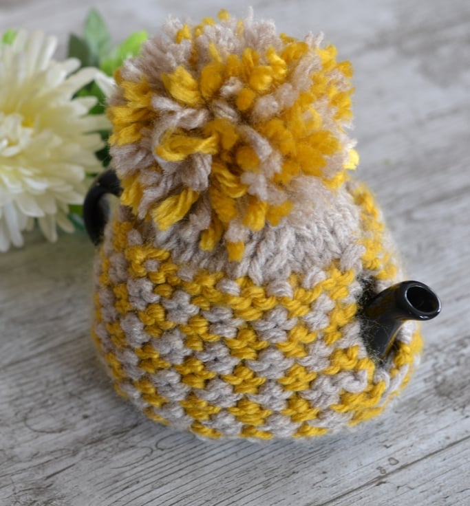 New design for this winter a super chunky knit tea cosie which is one of my own patterns. A lovely mustard shade with a light beige contrast.