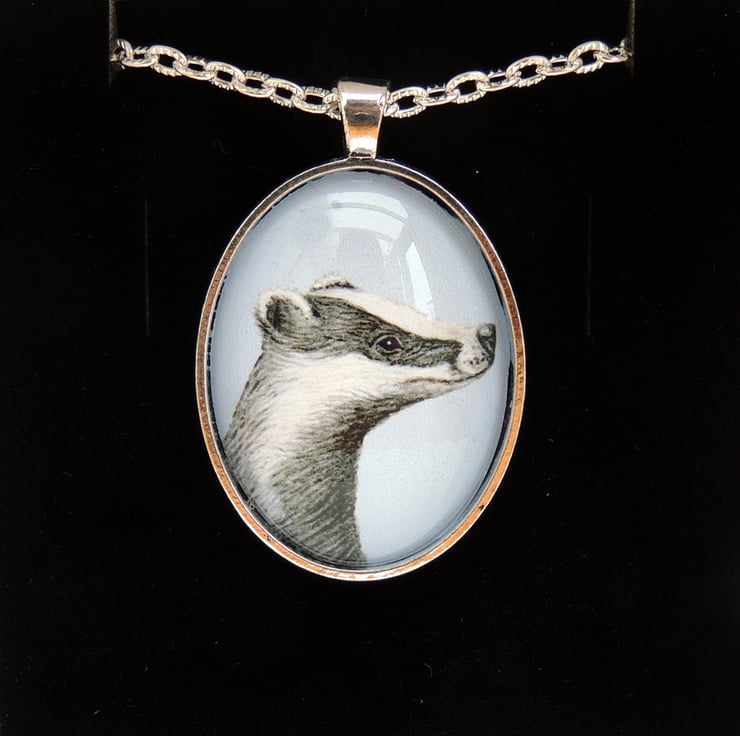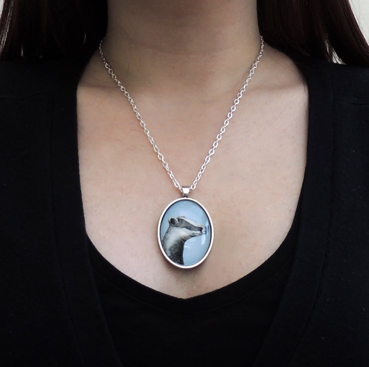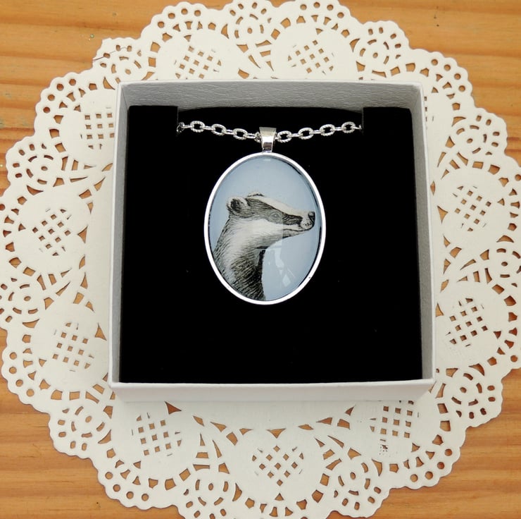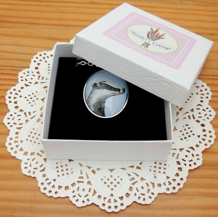 Antique silver effect necklace with a Badger illustration set in a sweet and simple cameo style pendant. Necklace comes presented in a Heather's Cottage box.