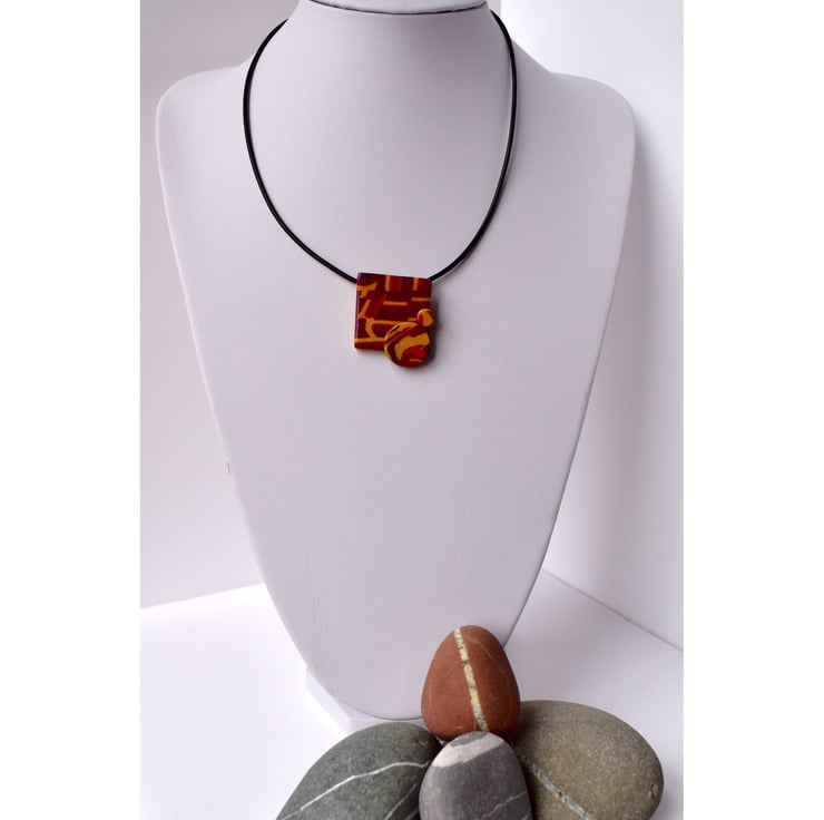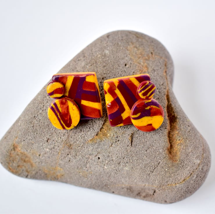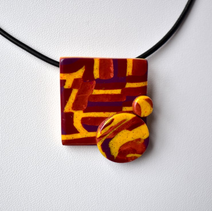 All the clay pieces of this pendant and earrings have been cut from my own handmade canes, which I slice and lay out to create random patterns. No two pieces are ever the same! Once the pieces have been constructed and fired, they are sanded and painted with a semi-gloss varnish.