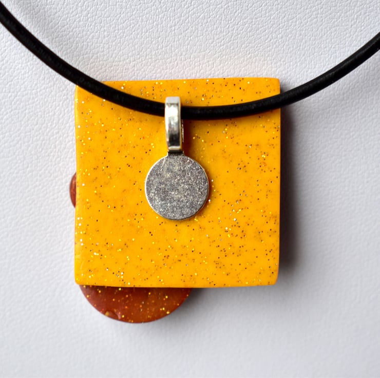 Two circles sit on one corner of the 3cm square pendant, giving the piece a slightly asymmetrical look. The pendant is threaded on a 46cm (18") leather necklace with a silver-plated extension chain.