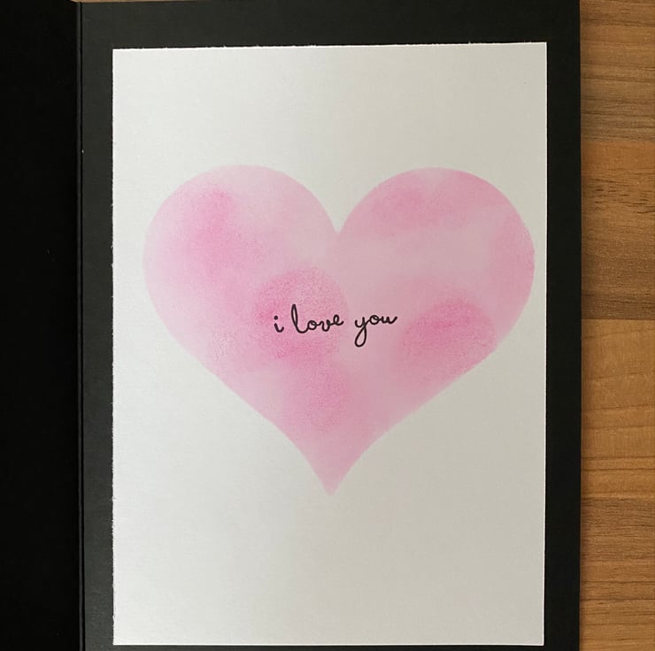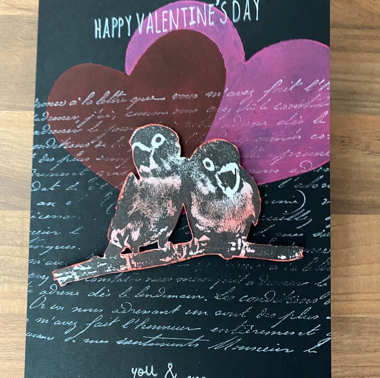 I created my own stencils with a set of heart dies and used acrylic paint at the top of the card. The love birds were stamped, fussy-cut and coloured using Distress Oxide ink in Picked Raspberry. The background was stamped using a French Script background stamp in white ink and the sentiment was stamped in white ink, before being written over using a white gel pen. The inside of the card has an Distress Oxide ink blended large heart in Picked Raspberry, with "i love you" sentiment stamped in black archival ink.
