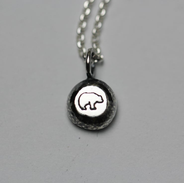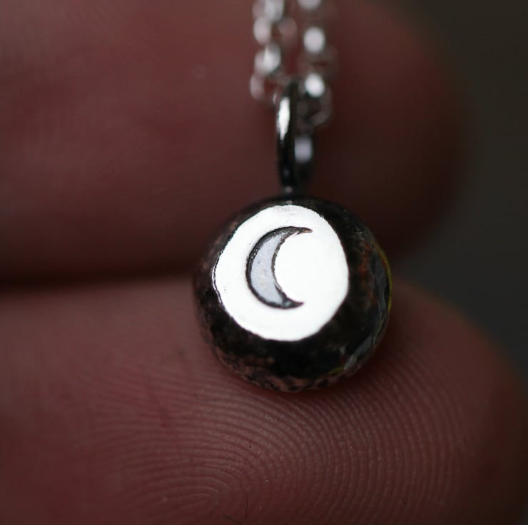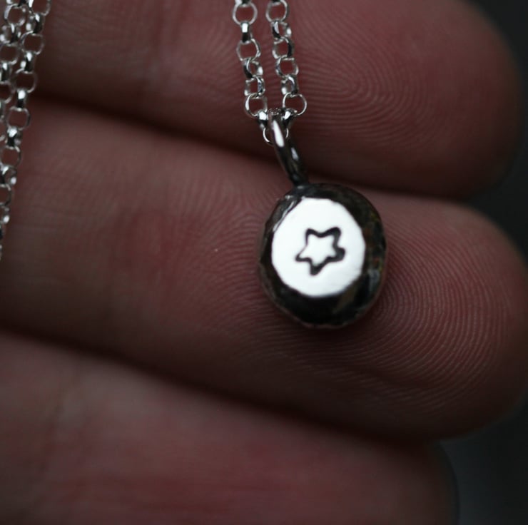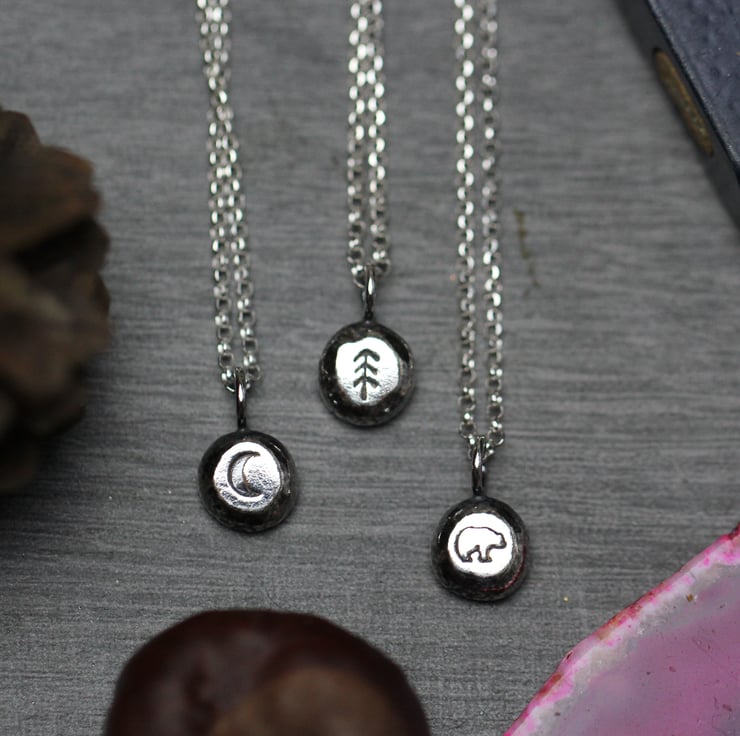 These pendants are made by melting silver into a ball, then hammering and filing to make them smooth. The designs are stamped onto the top, with a 925 stamp added to the back.