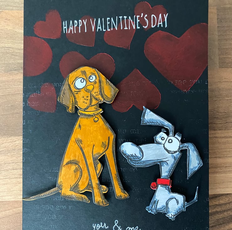 This year’s Valentine designed cards feature a row of acrylic painted hearts and the infamous Crazy Dogs stamp set from Tim Holtz.