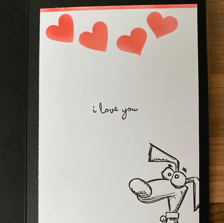 I created my own stencils with a set of heart dies and used acrylic paint at the top of the card. The dogs were stamped, die cut and coloured using Zig Brush Pens. The sentiment was stamped in white ink, before being written over using a white gel pen. The inside of the card has an Distress Oxide ink blended row of hearts in Candied Apples. The smaller dog and "i love you" sentiment were both stamped in black archival ink.