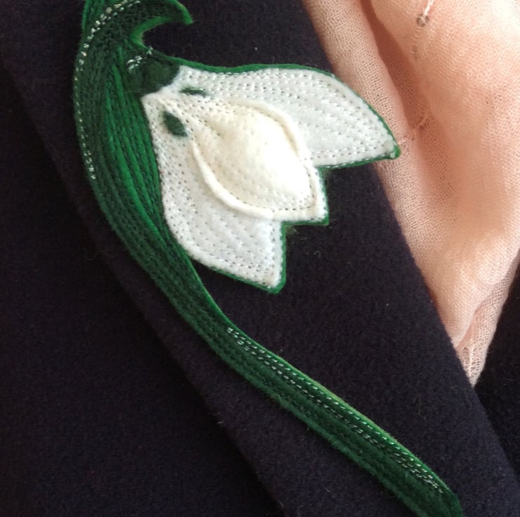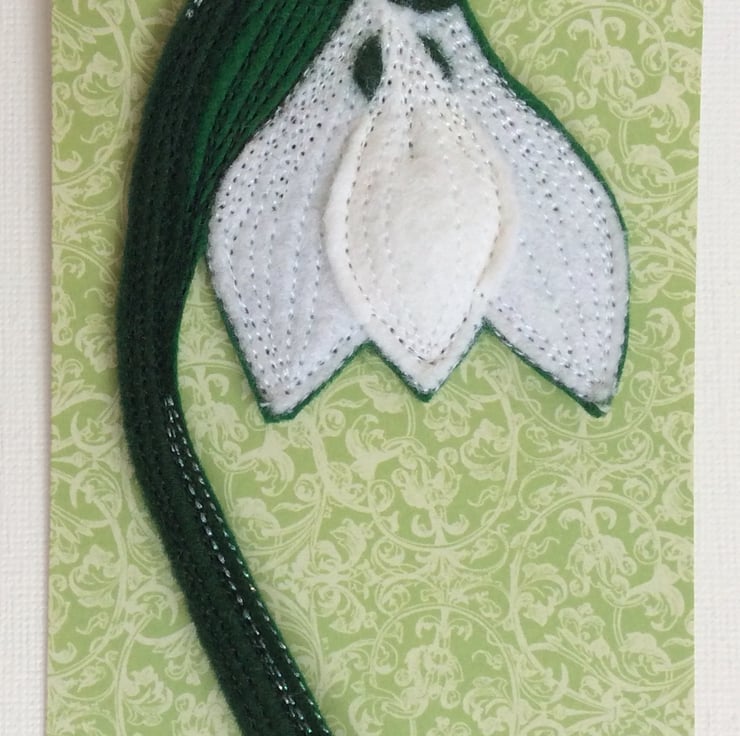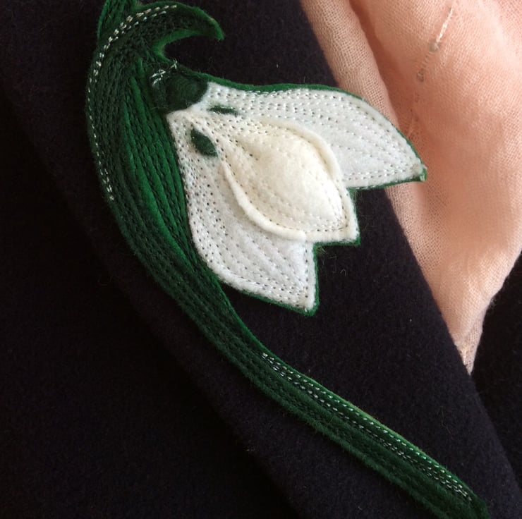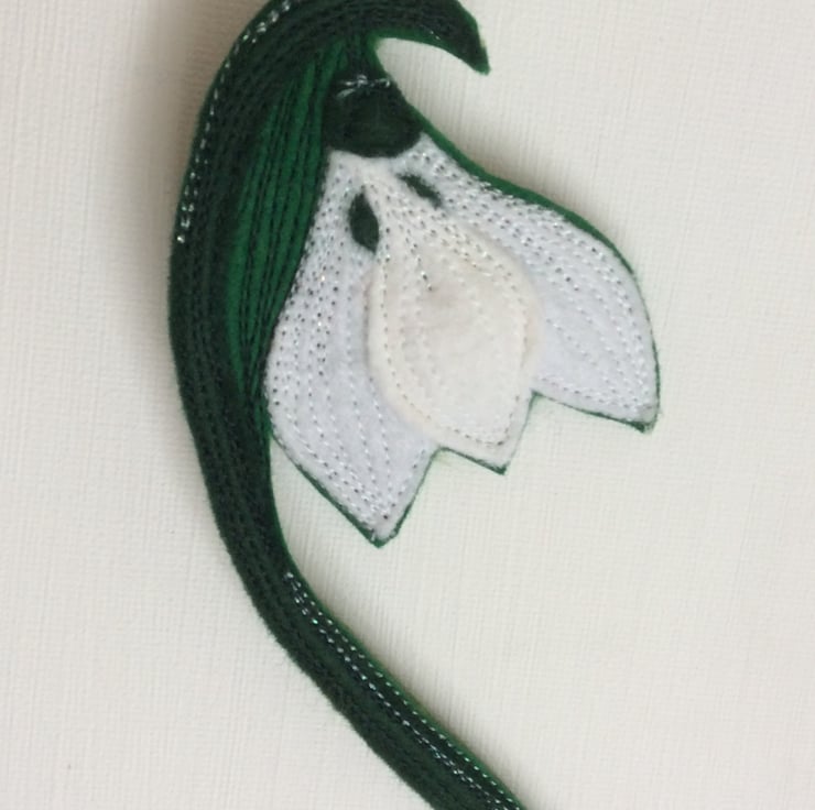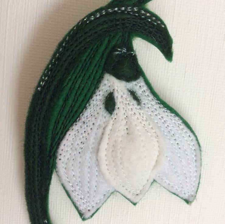 The snowdrop with leaf and stem is made from several layers of felt, decoratively machine embroidered together to give structure.