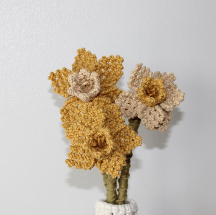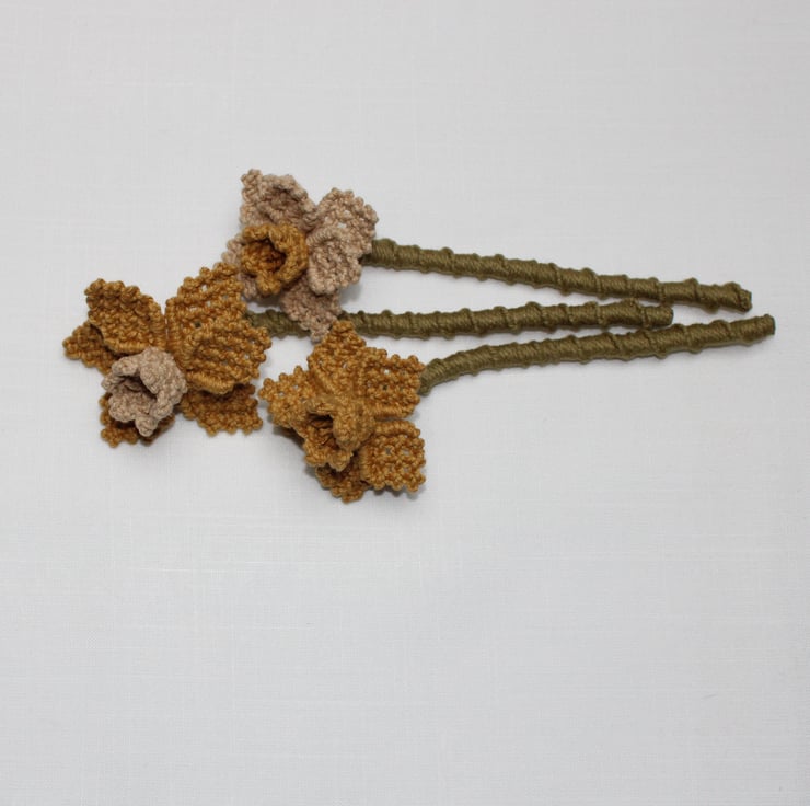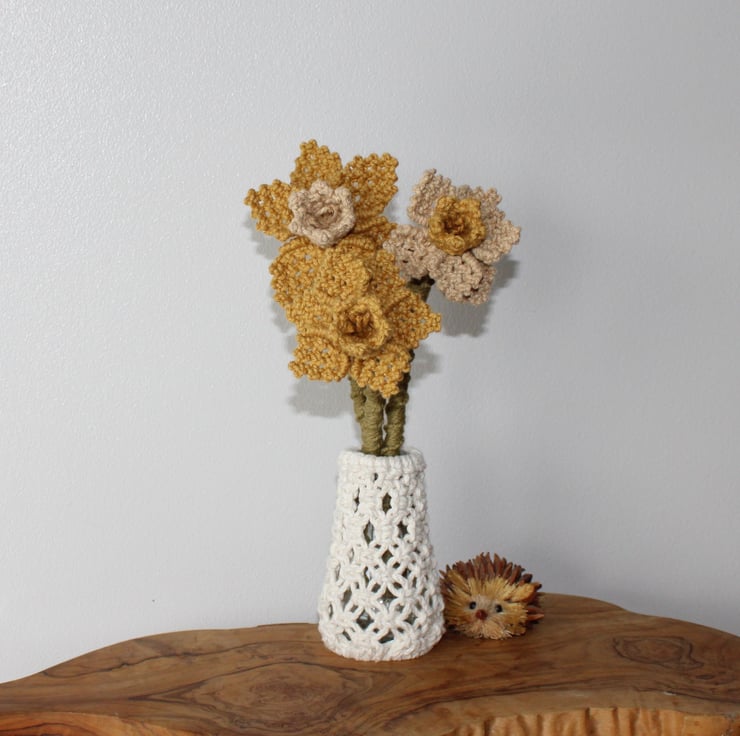 A pretty vase holding 3 gorgeous daffodils which have been made in earthy tones rather than the traditional bright hues. Each petal and trumpet has been individually handcrafted to create these beautiful macramé daffodils. The vase is a reed infuser bottle that has been upcycled and covered with a decorative macramé design. It has been made in a natural shade to compliment the colours of the flowers.