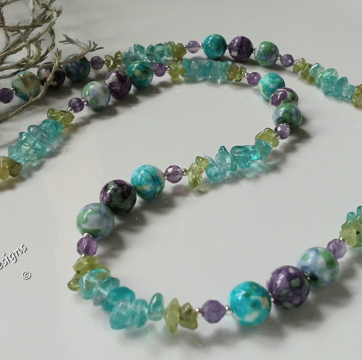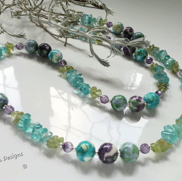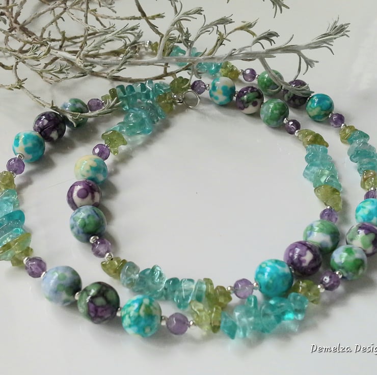 A beautif necklace designed and hand crafted using quality tumbled genuine parabia blue apatite and peridot nuggets, faceted 4mm amethyst rounds and 8mm variscite round bead gemstones.