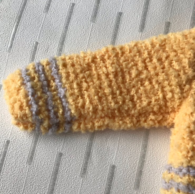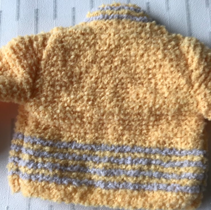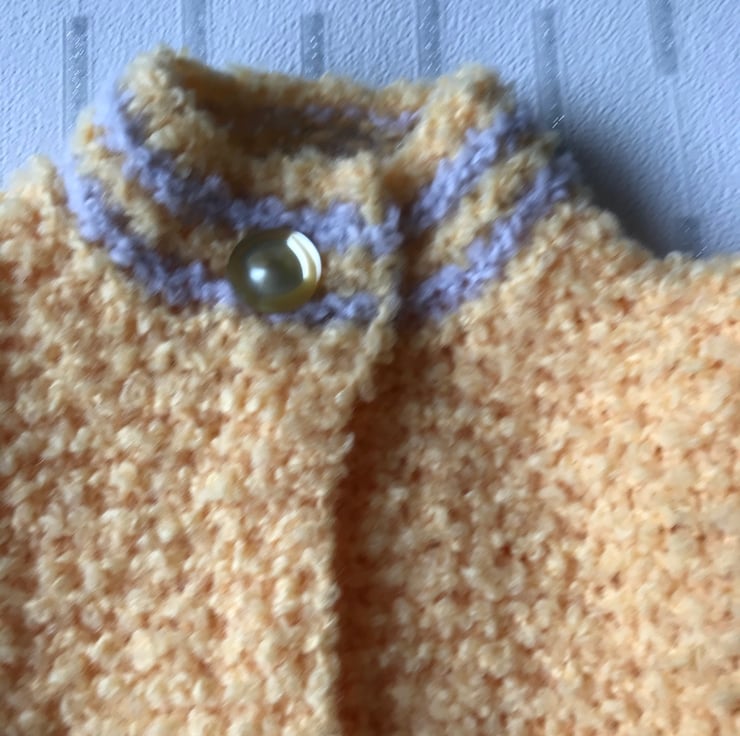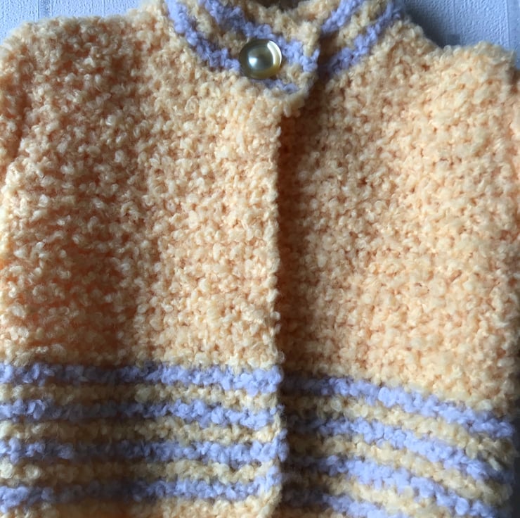 The hand knitted cardigan is worked in a very soft boucle yarn. The colour is a deep yellow and it has grey stripes at the bottom of the body and sleeves and also round the neckline. It fastens at the top with a yellow button.