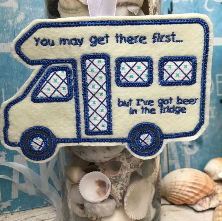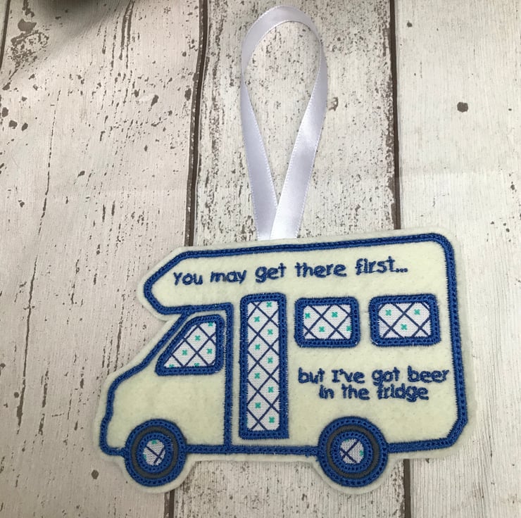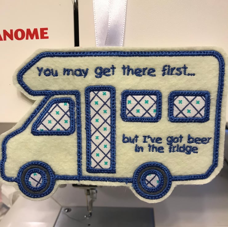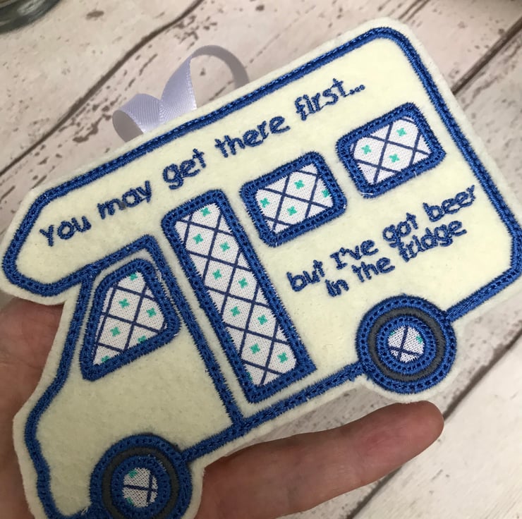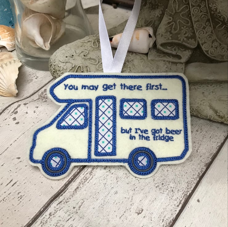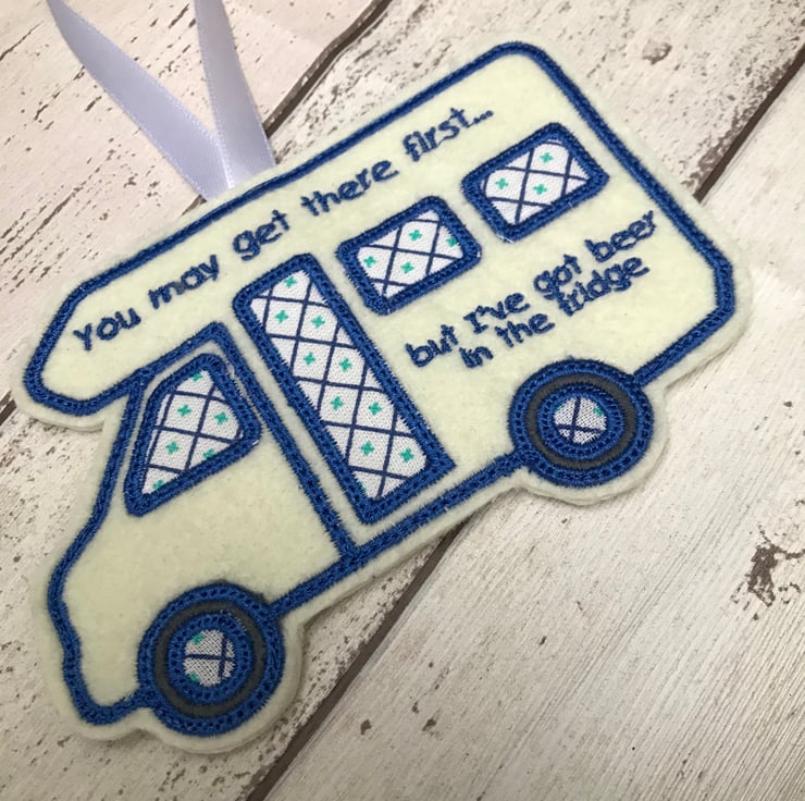 Cream felt Motorhome Funny Sign Gift Idea Hanging Decoration. A humorous sign of a motorhome with words. Cotton check fabric on windows and door. Own design stitched out by me.