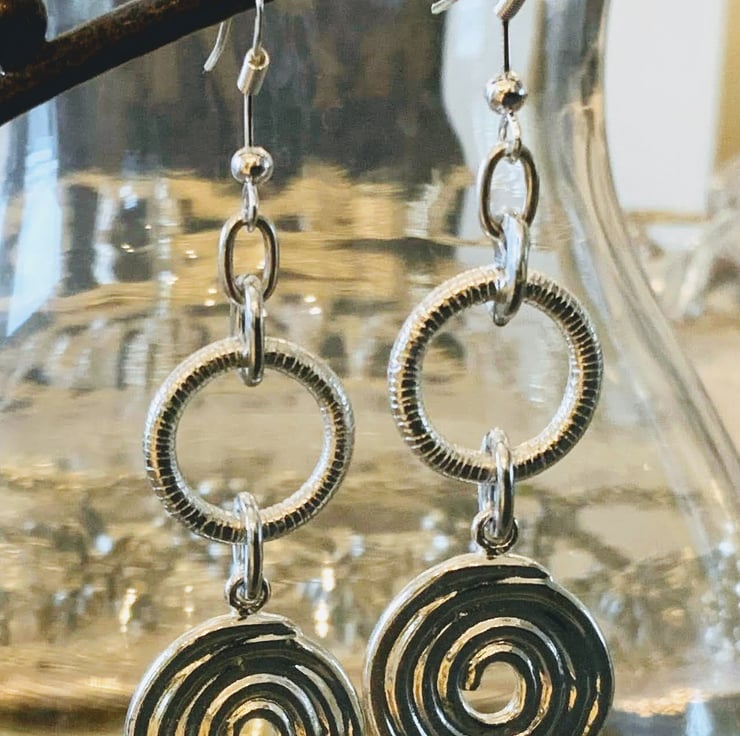 White metal spiral charm earrings featuring an embossed striped white metal loop on sterling silver ear wiresDangles that are light in weight.