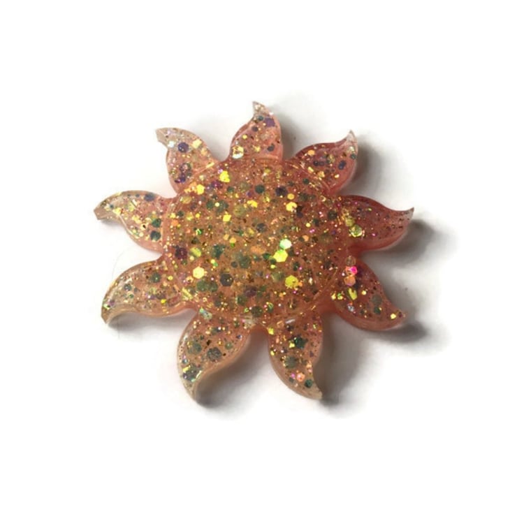 I add a layer of opal coloured glitters then a layer of semi translucent yellow and orange coloured resin to the back of the sun, once fully cured the roll over brooch clasp is added. Colours may appear different on various screens.
