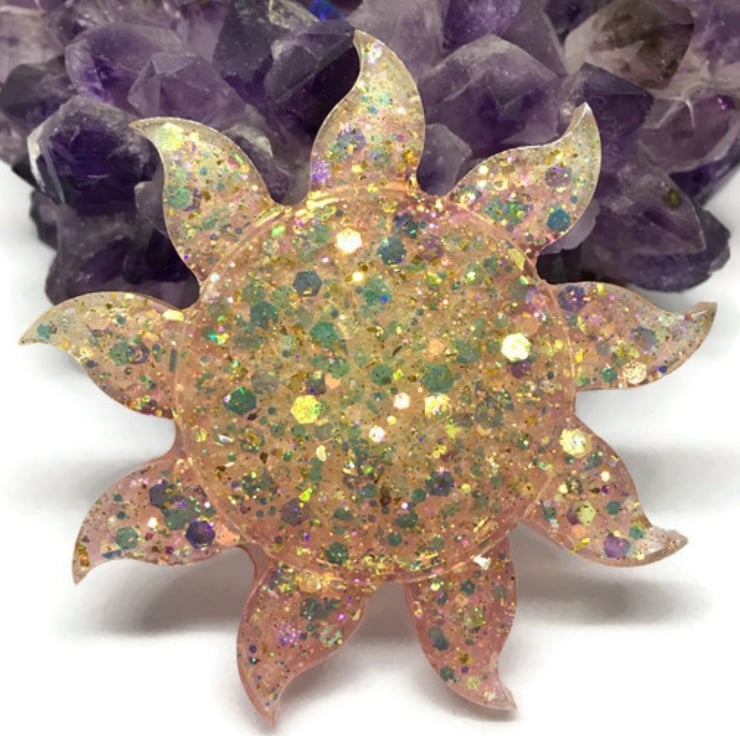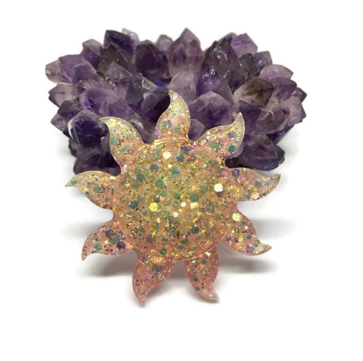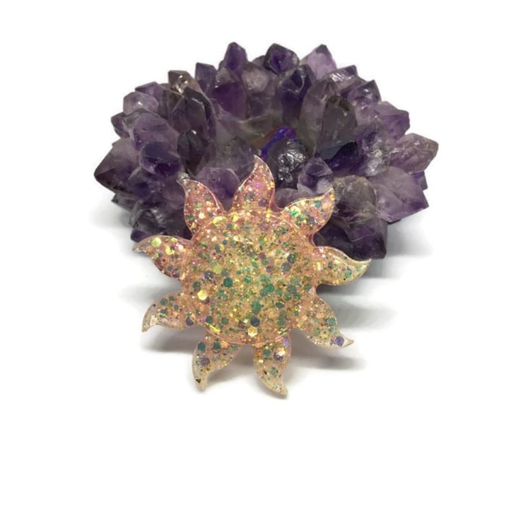 I made this stunning large statement sun with a blend of ethically sourced mica powders and pastel opal jewel tone colour changing chunky glitters with resin.
