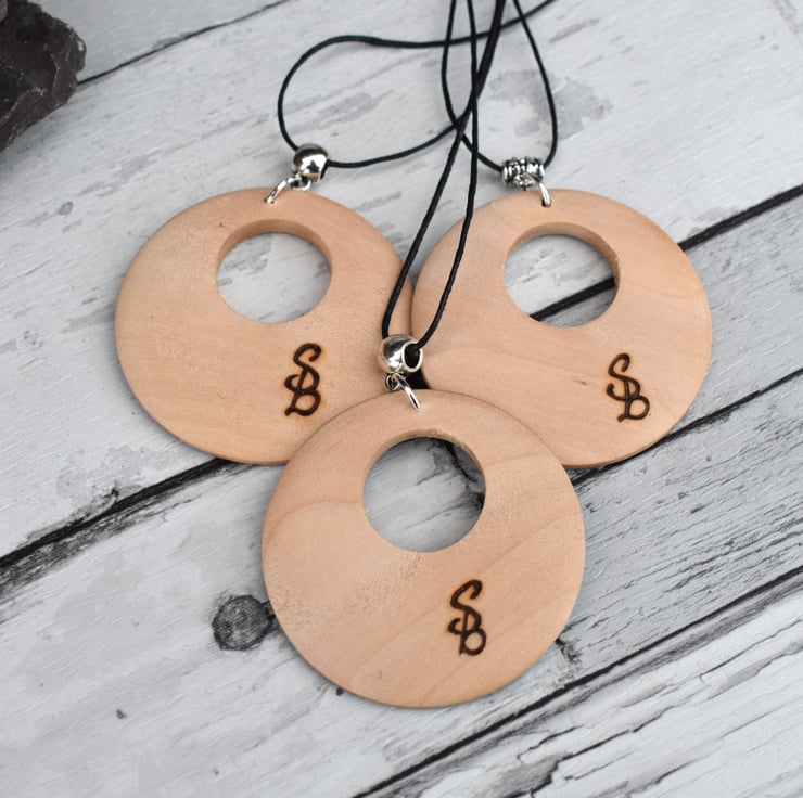 -The pendant is a wooden circle with cut out.