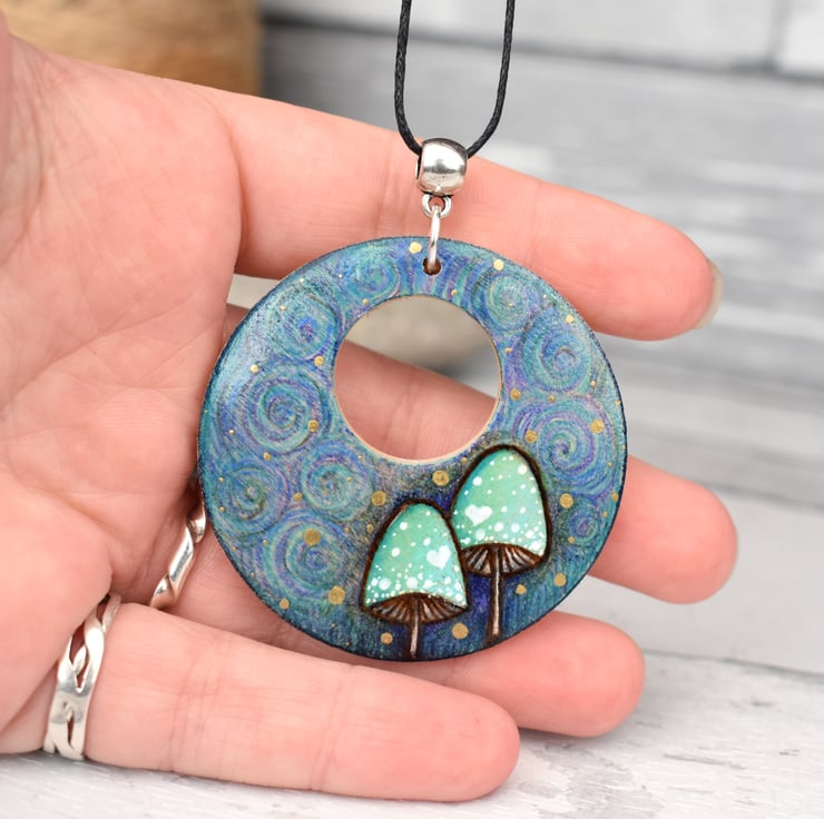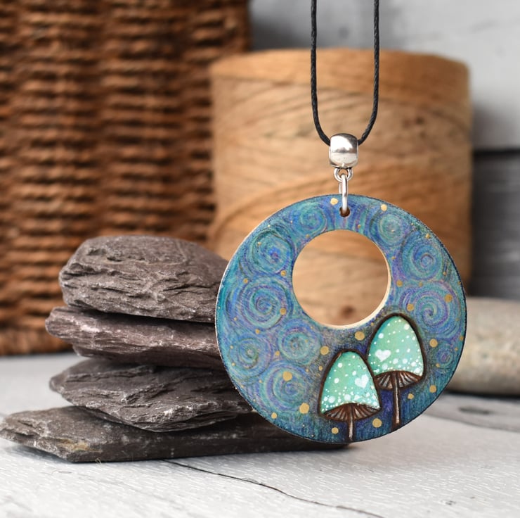 A couple of cute minty toadstools adorn this swirly pendant. It's a circle shape with a cut out to the centre. The design has been hand burned using pyrography, then coloured with art pencil.