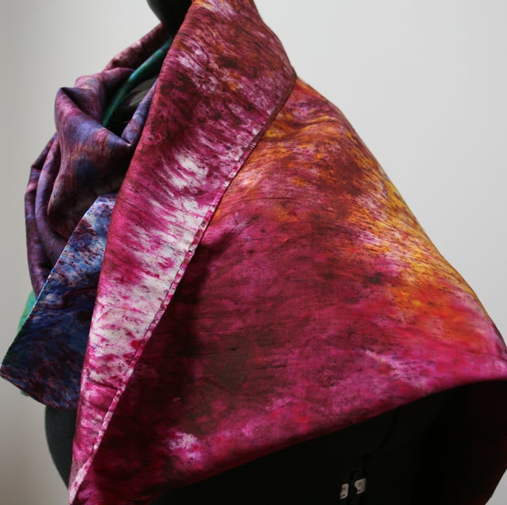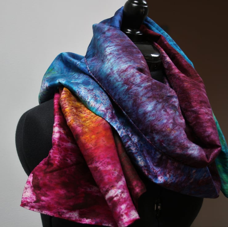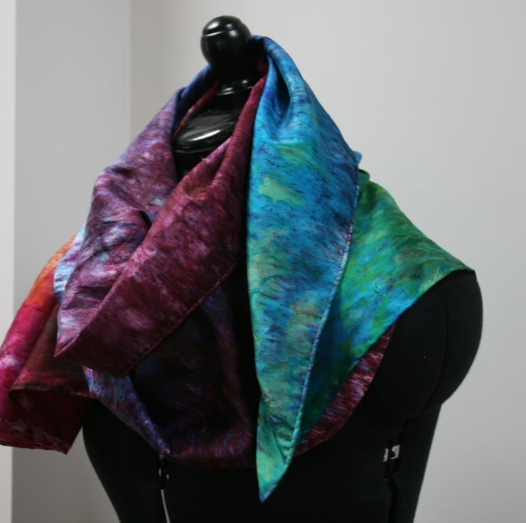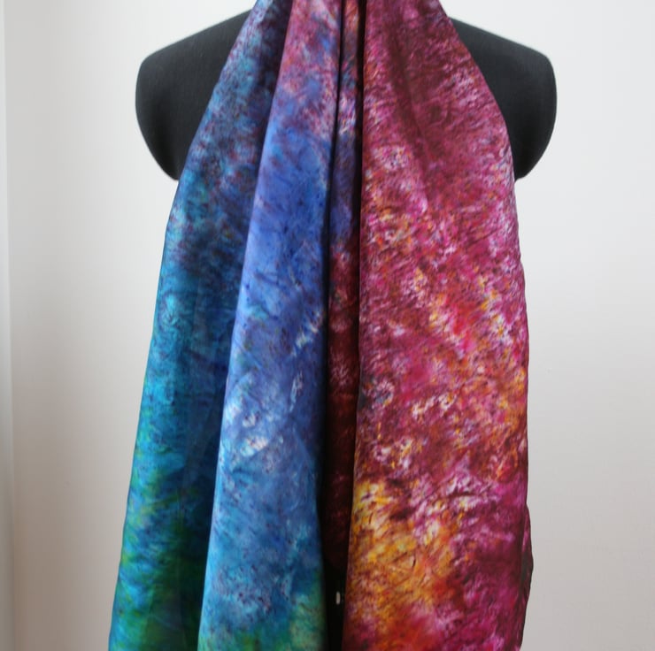 A hand-dyed silk scarf, great for giving a unique accent of colour to your outfit. Hand-dyed in rainbow shades by me in Oxfordshire, and completely unique!