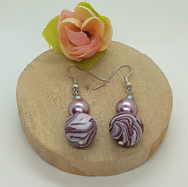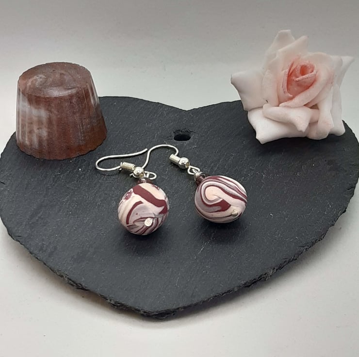 Handmade polymer clay earrings in a raspberry, grey and cream swirl pattern The handmade bead measures approx 12mm with a 6mm pearly pink bead and silver plated spacer bead.