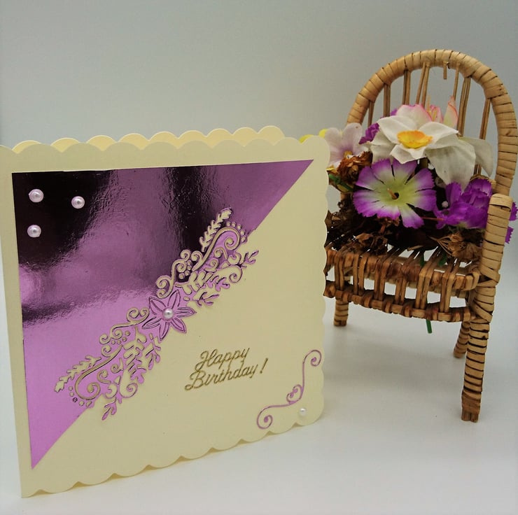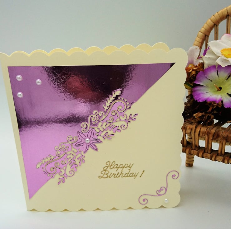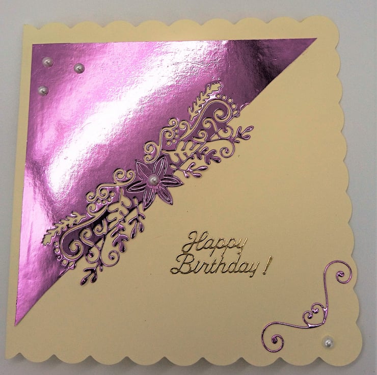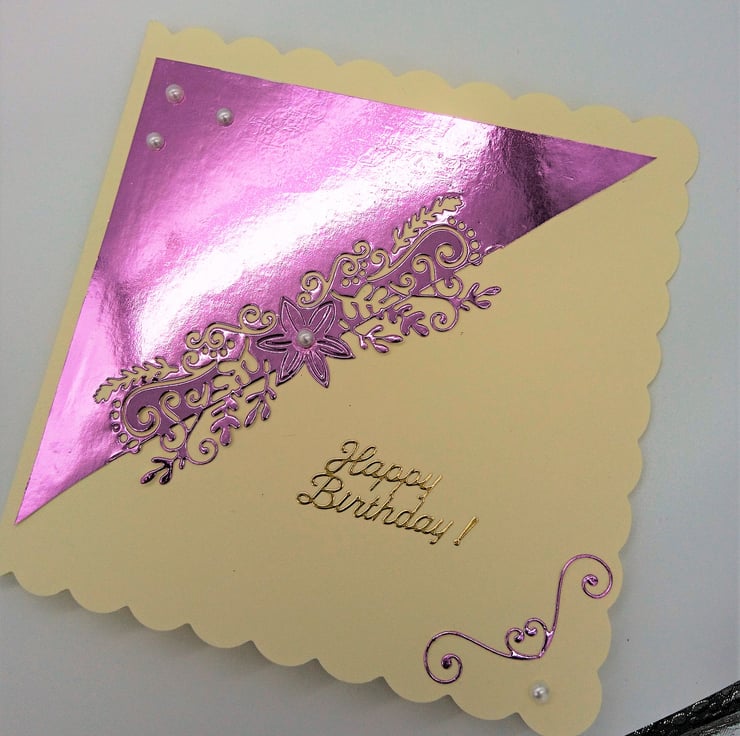 DESIGN: Top quality tent fold ivory scalloped card. Decorated with layered pink mirror triangular floral die cut panel and pearl gems, completed with gold sentiment and swirl.
