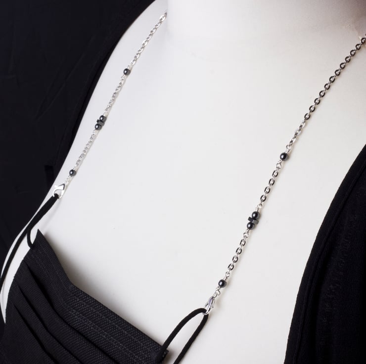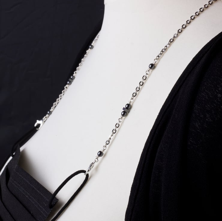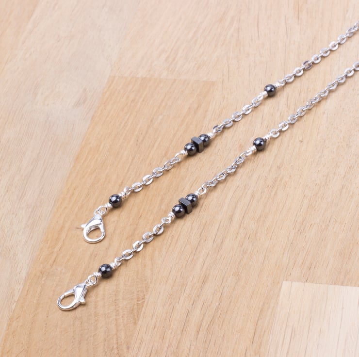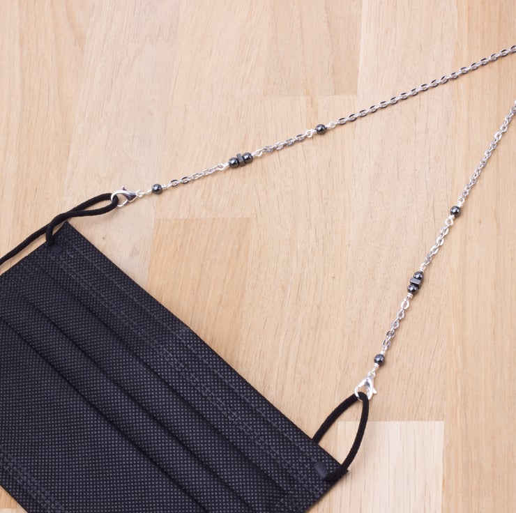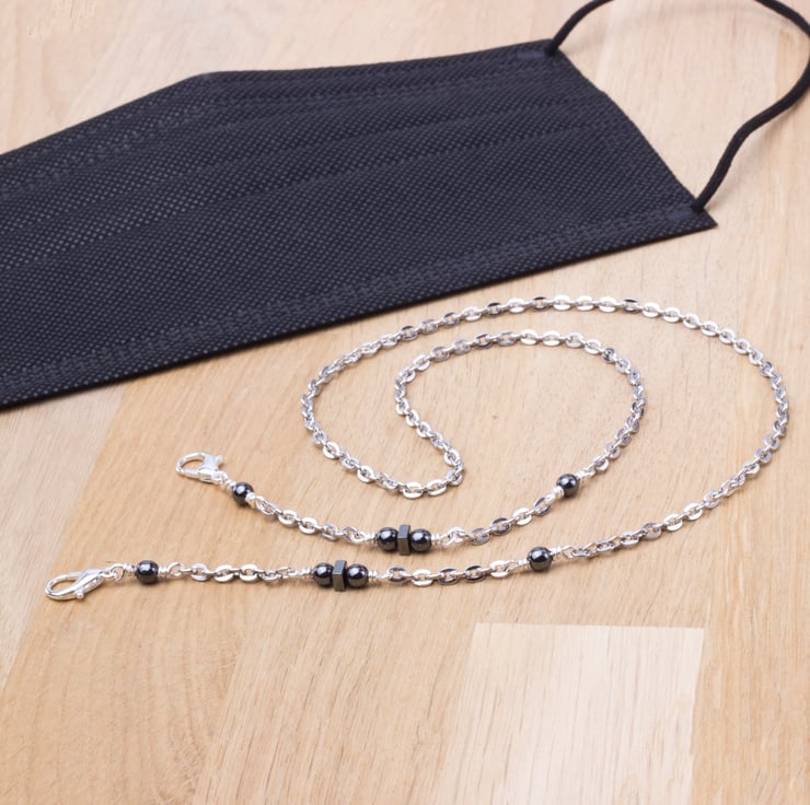 This chain features round and square hematite stones. These are wire wrapped in a silver-tone oval link chain, finished with lobster clasps to hold your mask. Approximately 22 inches long.