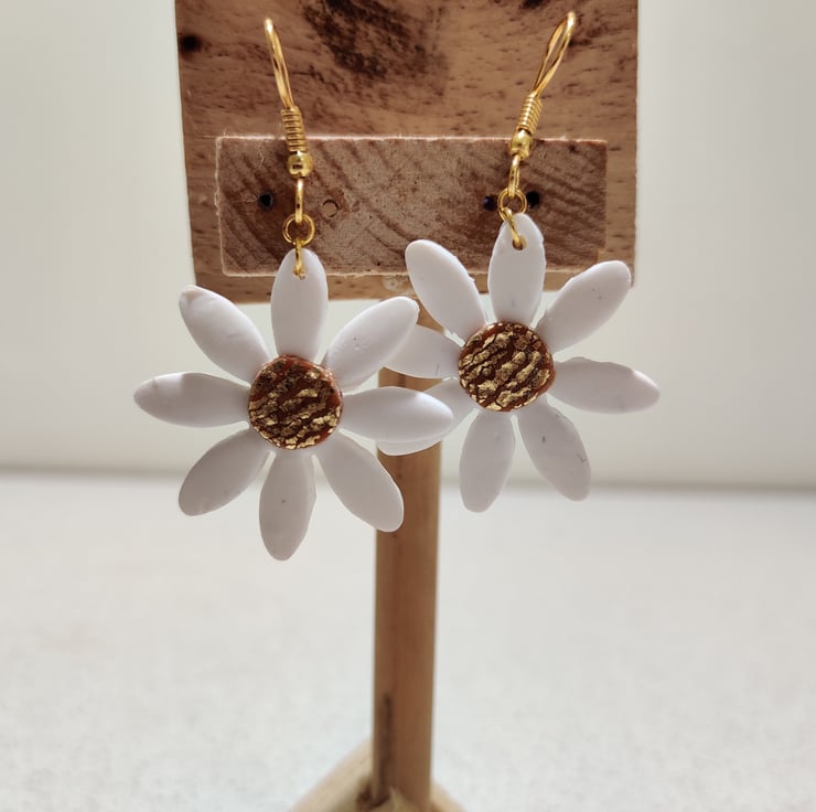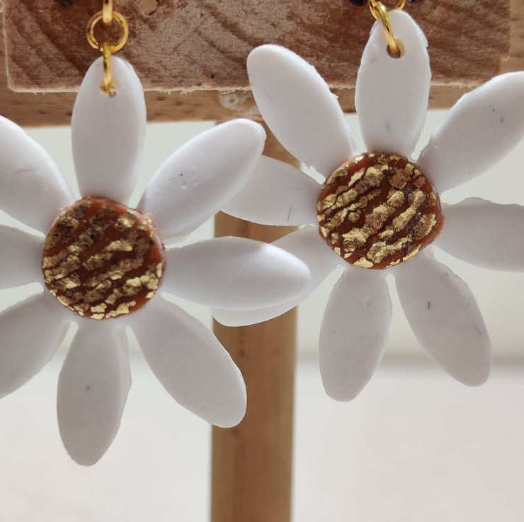 Hand made polymer clay earrings shaped as a daisy and covered in gold flake centre. Medium size. Hook fixing which can be painted with hypoallergenic coating on request for free. Please see all photos for close up detail All products handmade therefore there may be minor imperfections. Each pair sold as seen, message for more info