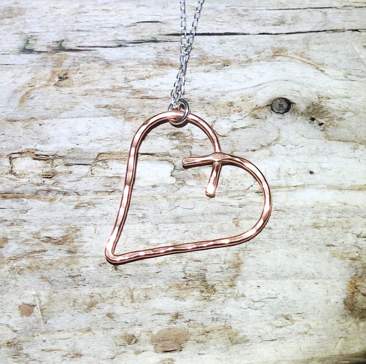 I have made this beautiful pendant from copper wire which I have fashioned into a heart shape and then soldered before giving it a hammered and polished finish.