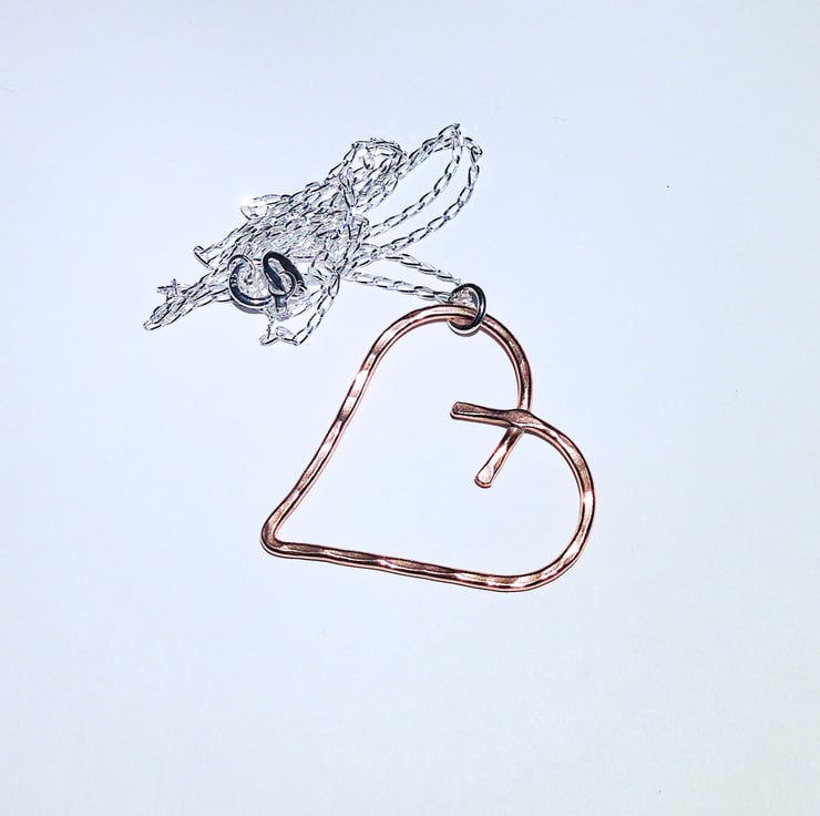 I have made this beautiful pendant from copper wire which I have fashioned into a heart shape and then soldered before giving it a hammered and polished finish.