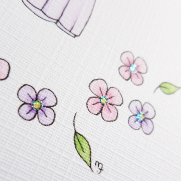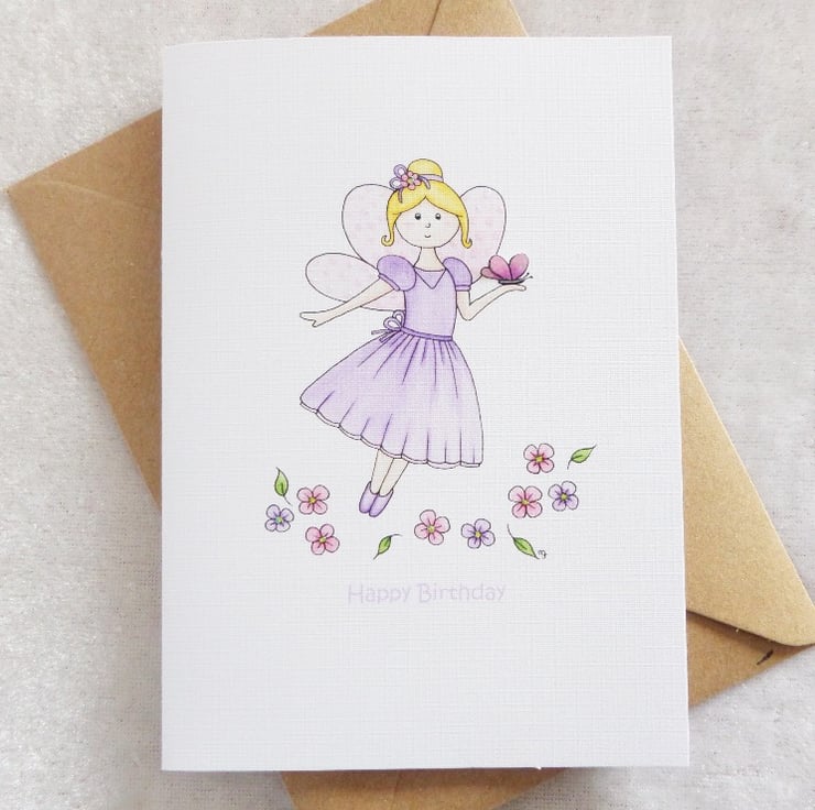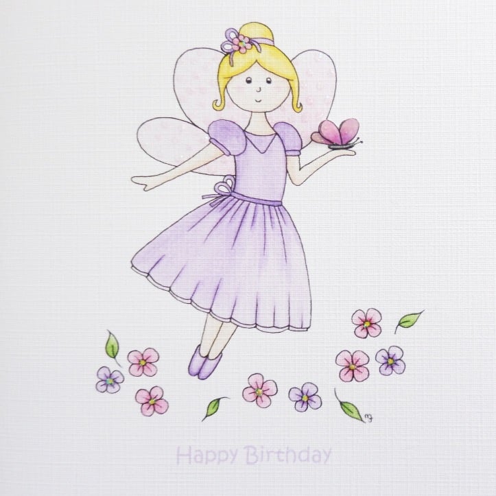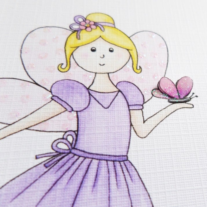 This pretty fairy card has been designed using my own original watercolour illustration. The image has been printed out onto good quality card and embellished with glitter detail. The little butterfly has been cut out by hand and decoupaged up to give a 3D finish. I have also added lots of lovely glitter detail.