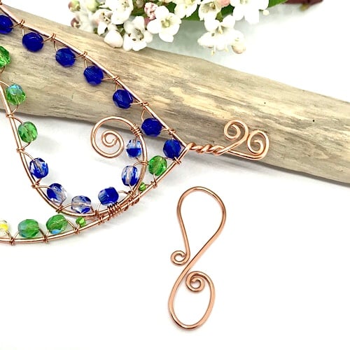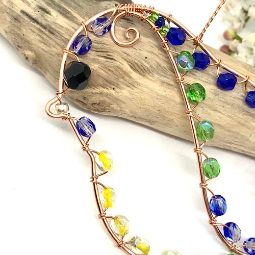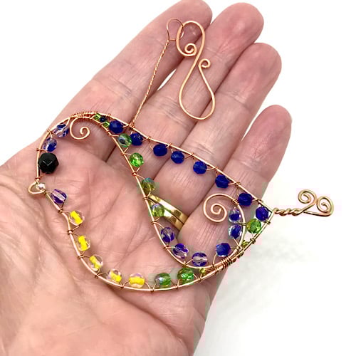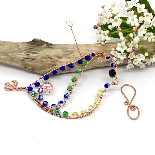 I have used copper wire to create the shape and frame of the blue tit and added extra copper wire with swirls for the wing. I have wrapped sparkling crystals beads in blue, green and yellow around the shape. Twisted wire for the loop snd a handcrafted hook for hanging.