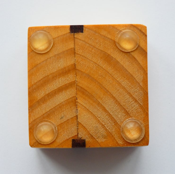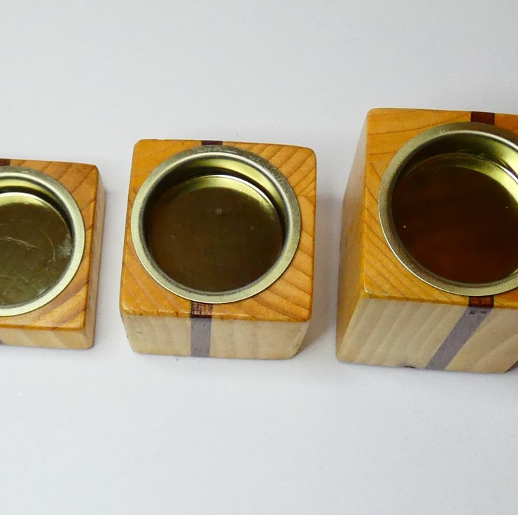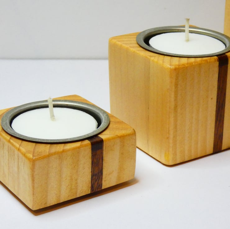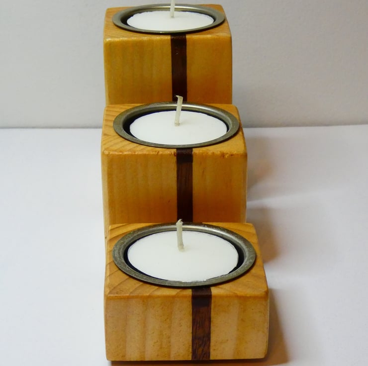 Pieces of recycled wood were cleaned and sanded to enable me to upcycle them. Grooves were cut into each candleholder, and inlays of Sapele were glued into place. The edges were then gently chamfered before being sanded to a smooth finish. They were covered with a coat of Shellac and fitted with brass candle holders, as recommended by Trading Standards.