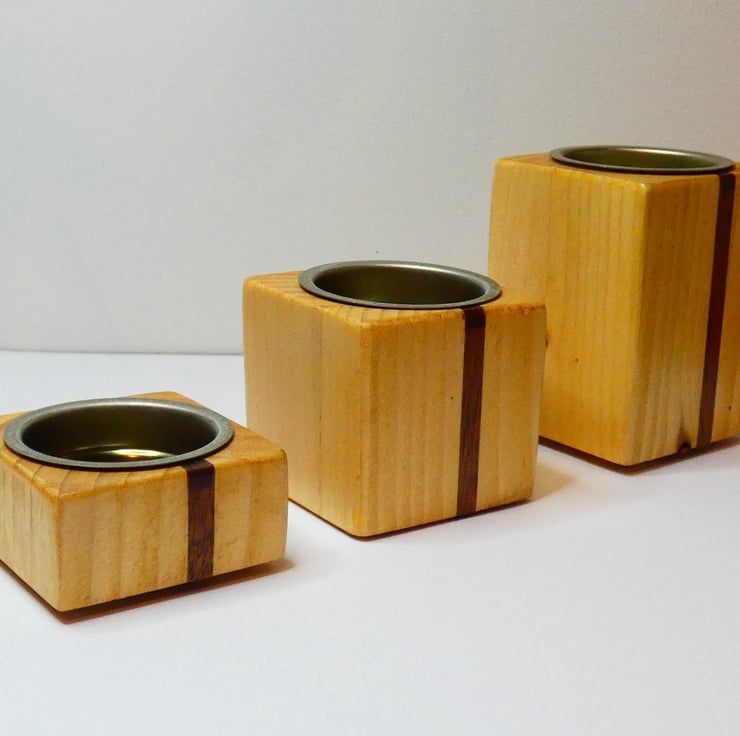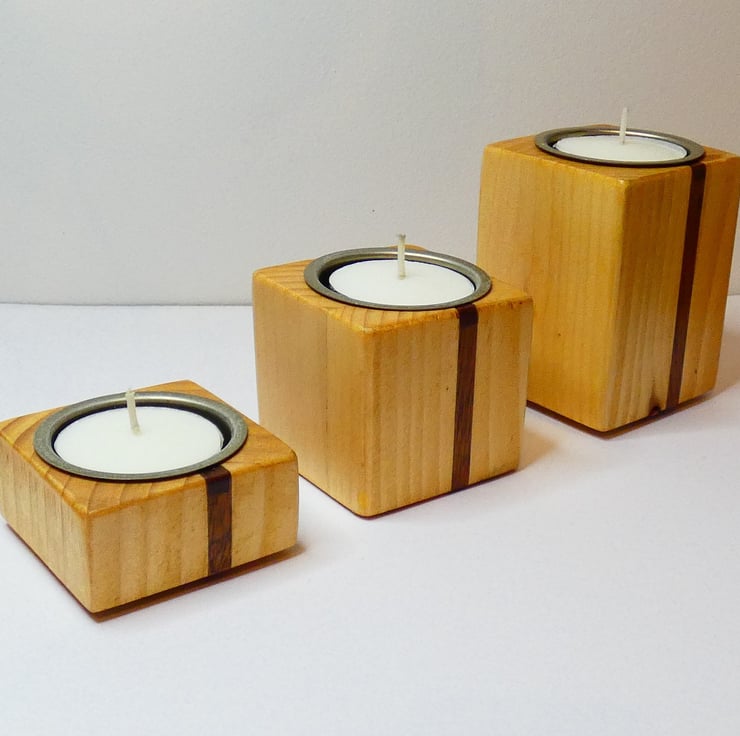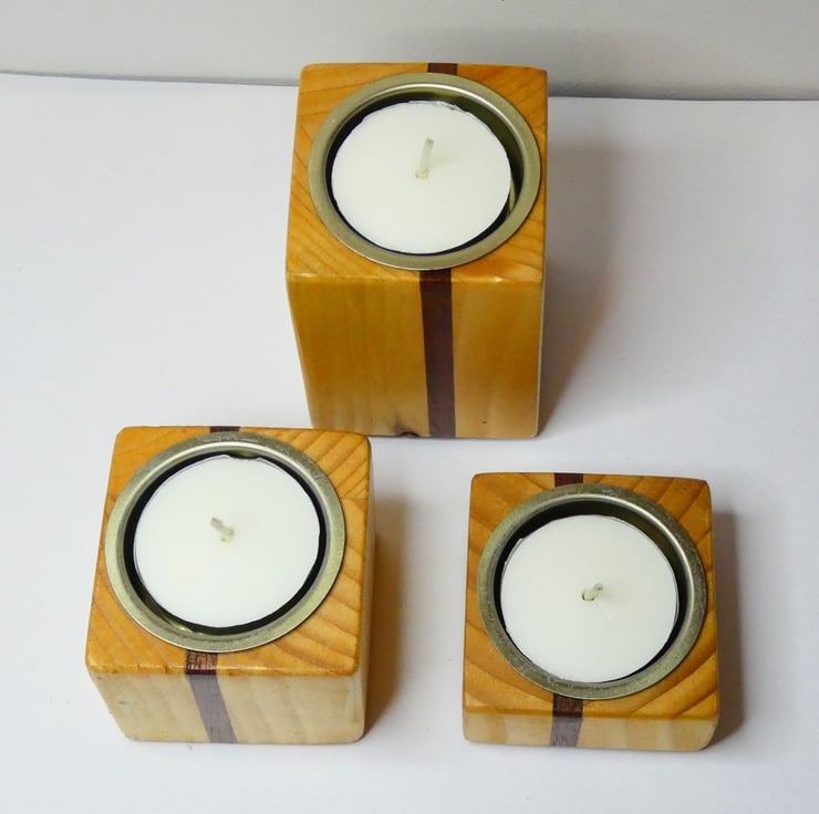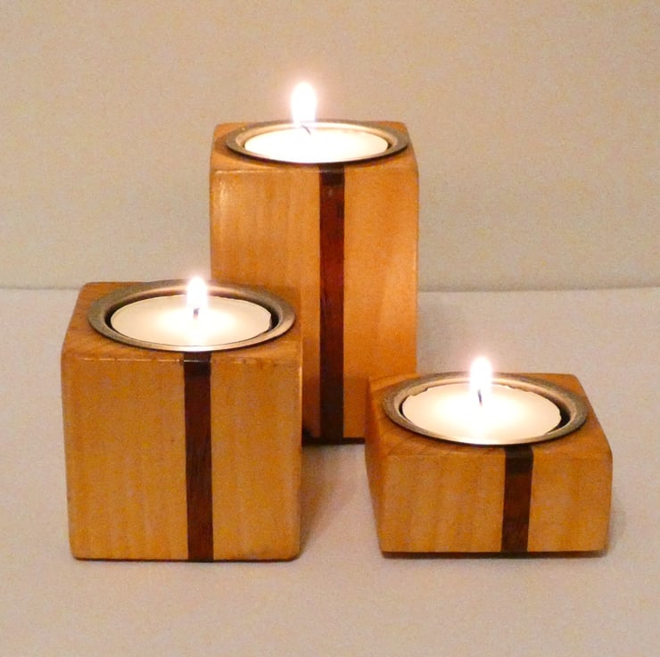 Handmade from Pine Wood this unique set of 3 rustic, candle holders has been upcycled from reclaimed wood. The inlays are Sapele wood, often known as African Mahogany. They can be used together or as individual pieces. These tea light candleholders make a fantastic fireplace piece or table top eye catcher. A perfect present for a number of occasions such as a housewarming gift, a teacher's gift, a Christmas Gift, or even an anniversary gift for a cosy, romantic evening.