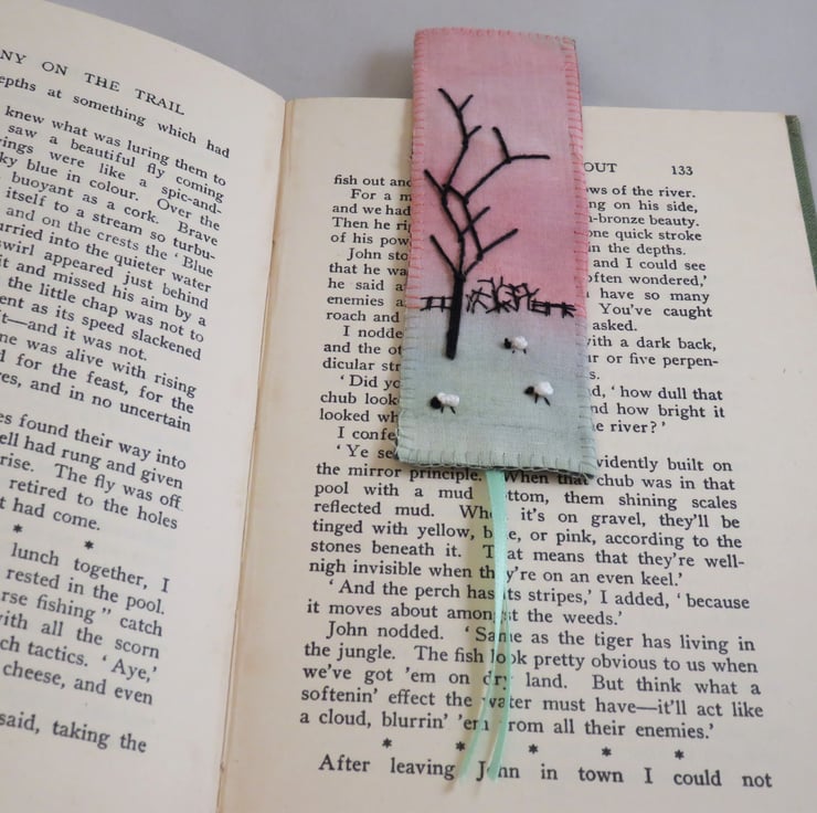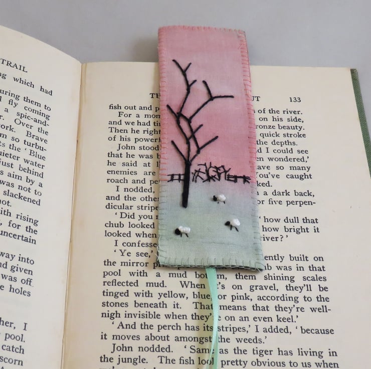 Fabric paints were used to create the background for this bookmark. Details of tree, fence line and tiny sheep have been added by hand embroidery in cotton threads. Matching cotton threads have been used to blanket stitch around the edge of the bookmark which has been backed with a layer of felt.