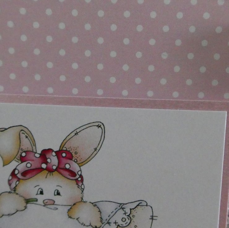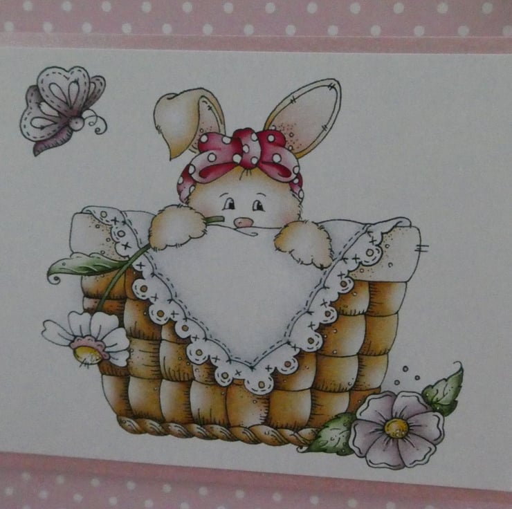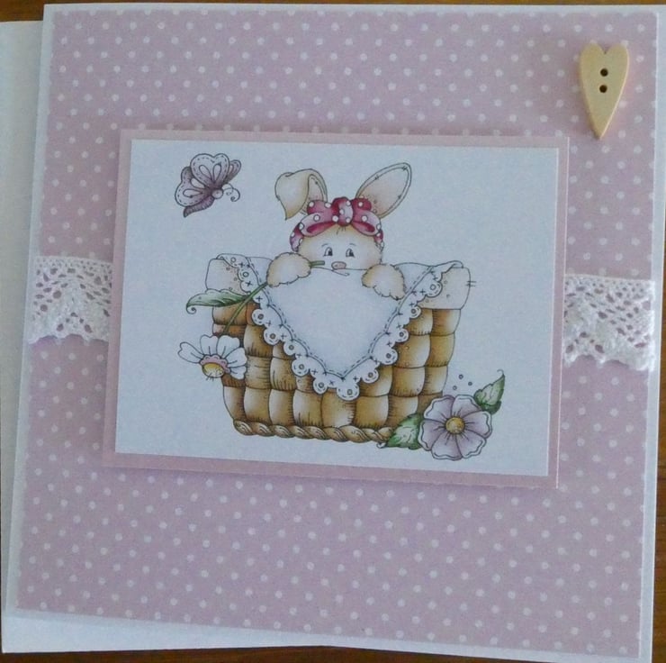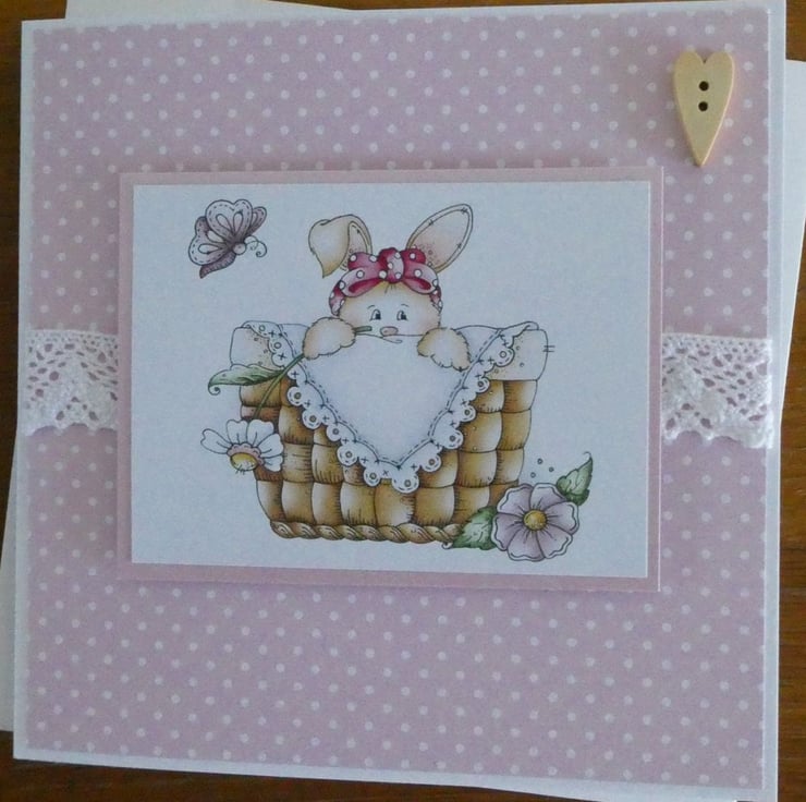 This cute card has a printed topper showing a rabbit popping out from a picnic basket, with lilac flowers and a butterfly.