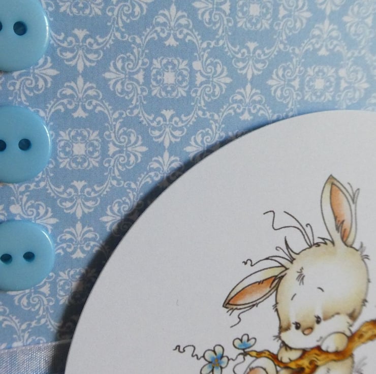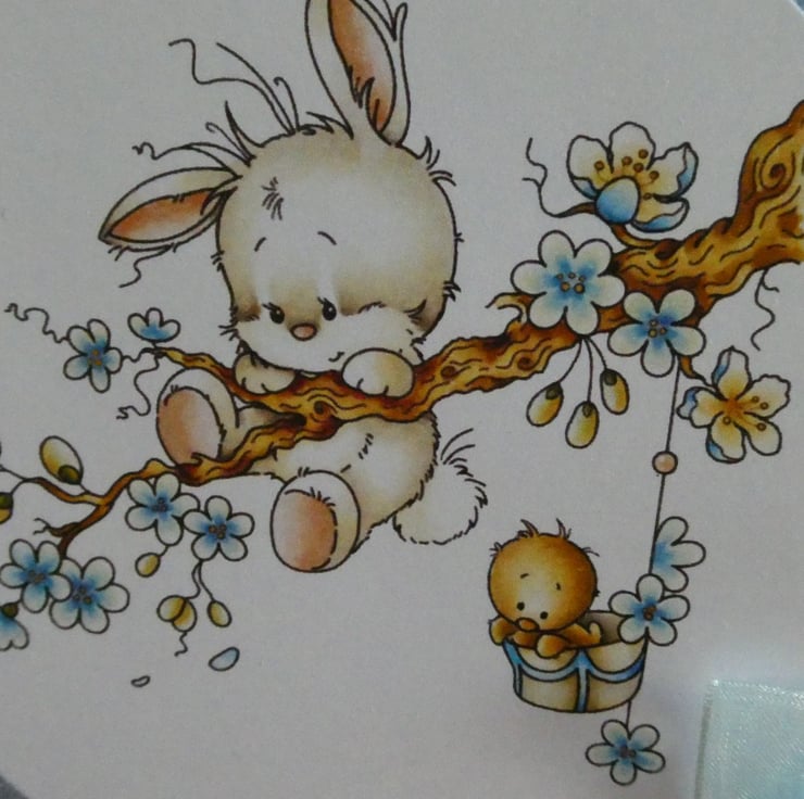 This cute card has a printed topper showing a rabbit climbing on a branch with a little bird in a basket for company.